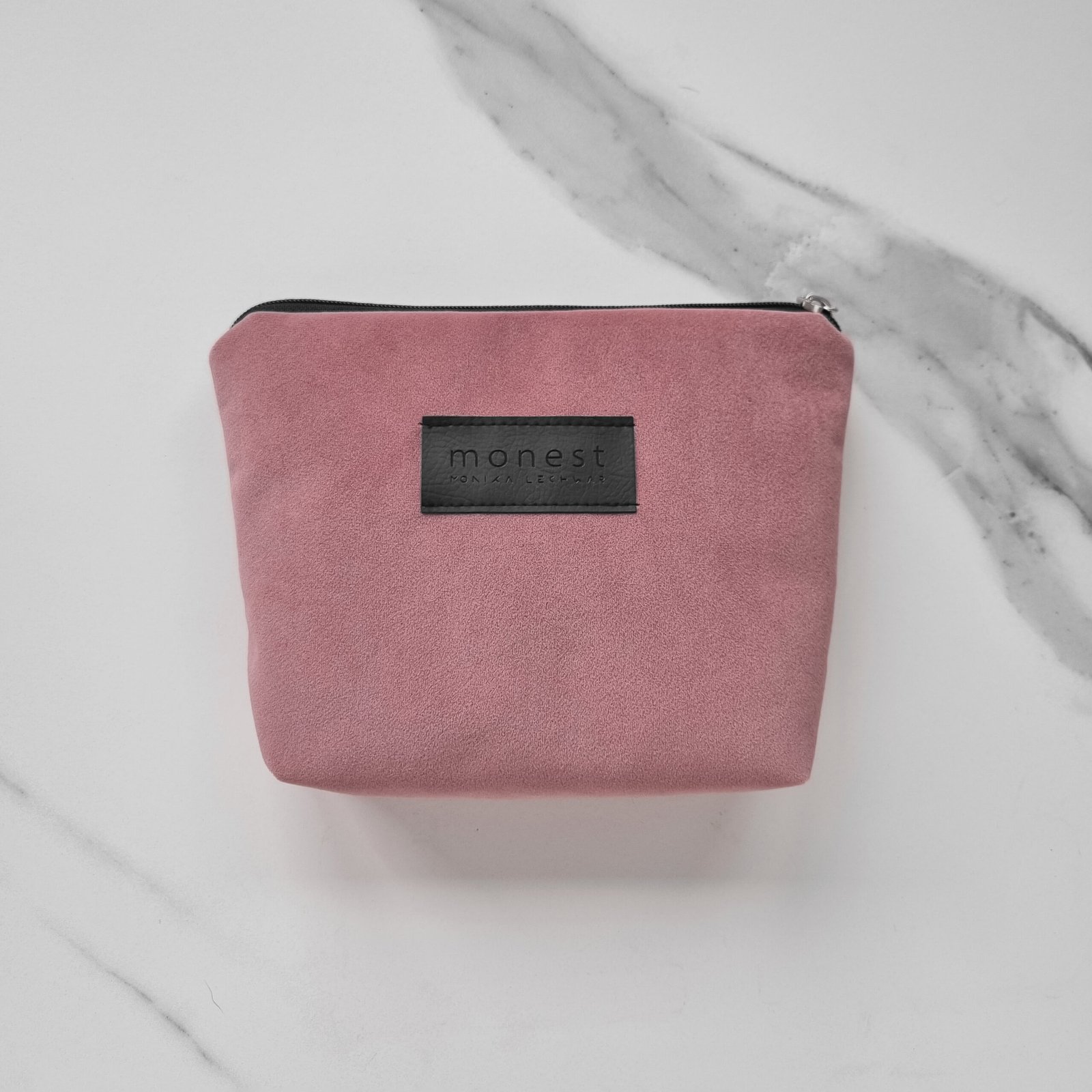 Mała kosmetyczka podręczna w kolorze indyjskiego różu, uszyta z miękkiego weluru tapicerskiego. Środek wykończony czarną grubszą podszewką z bawełny. Idealnie sprawdzi się również jako organizer na drobiazgi do Twojej torby lub szuflady. Na froncie tłoczone logo marki z eko skóry.