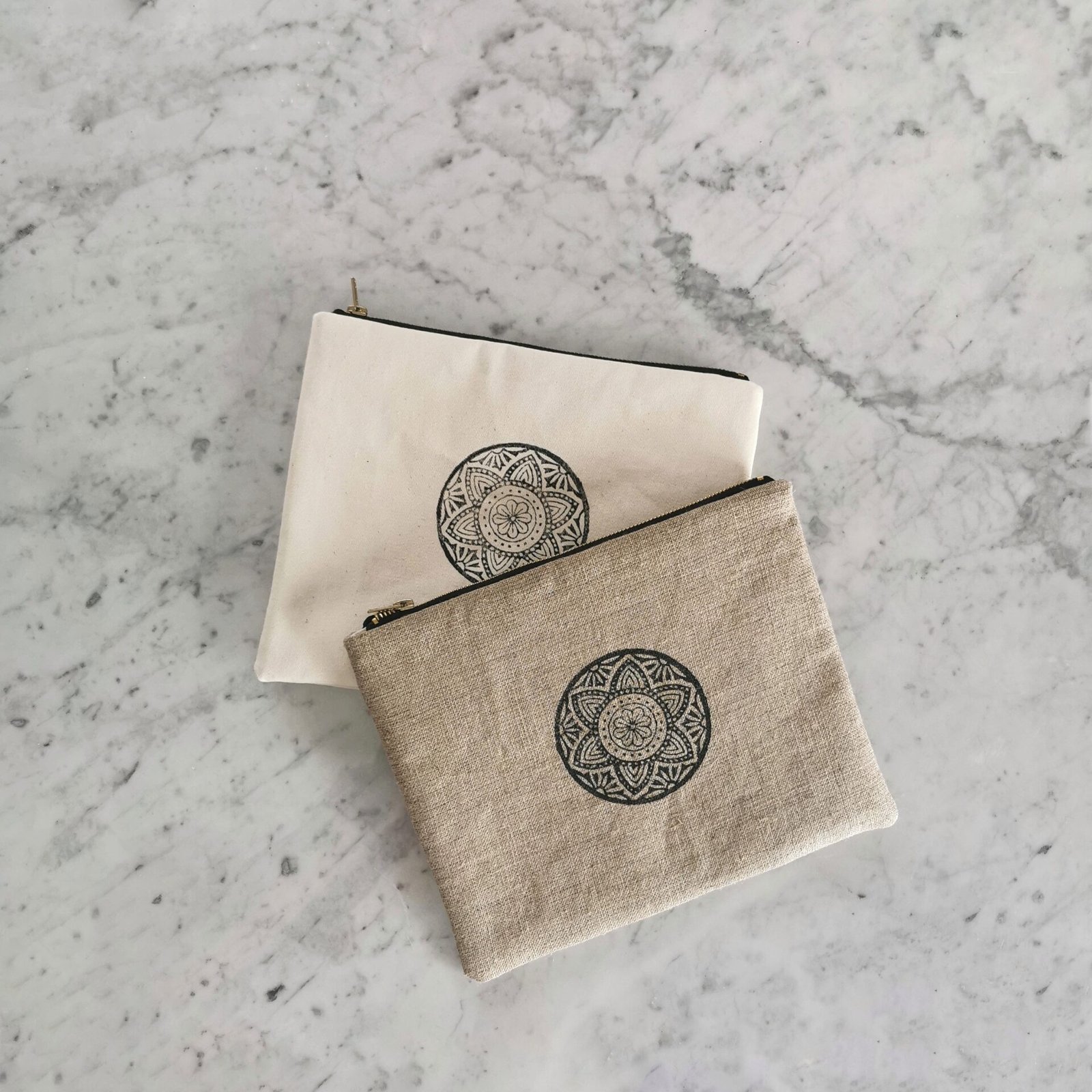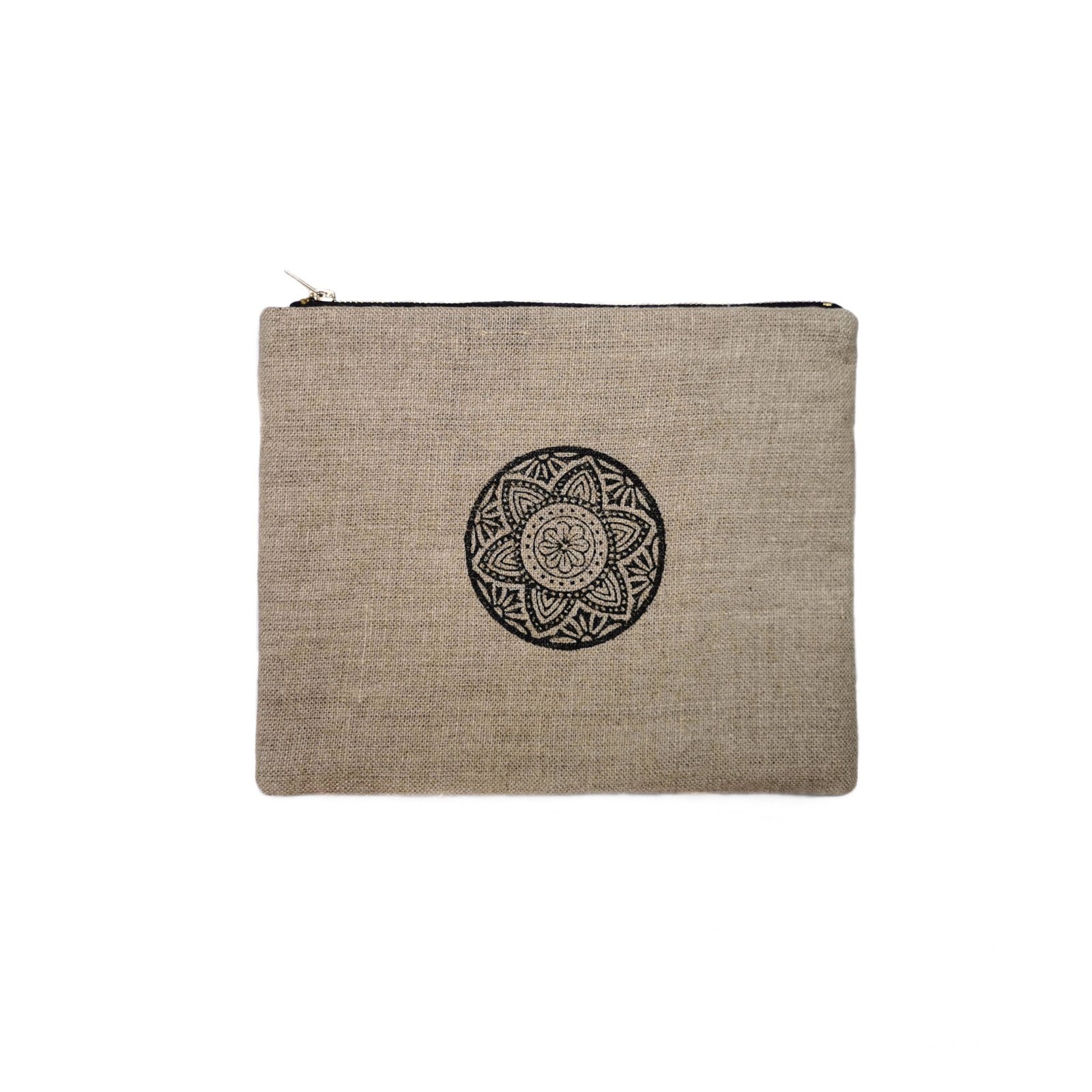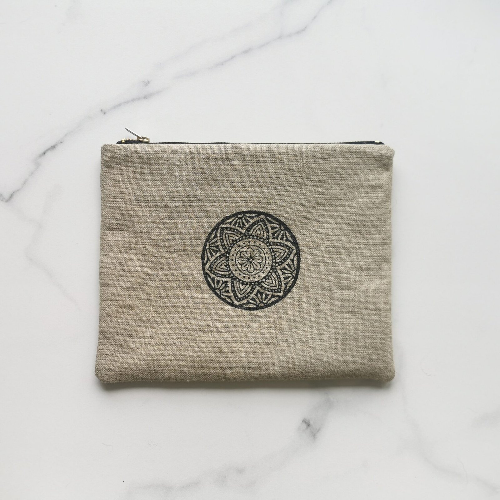 Niewielka kosmetyczka z autorskim wzorem mandali, wykonana z surowego lnu.