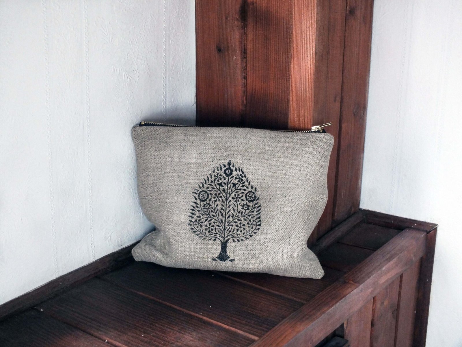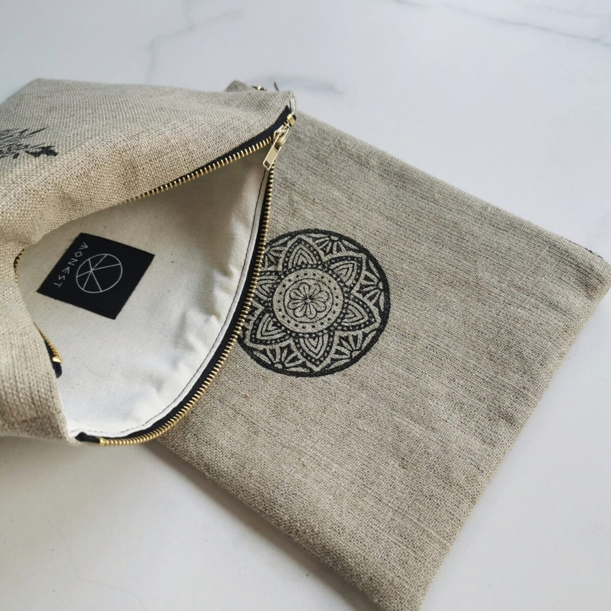 Kosmetyczka uszyta z surowego lnu, wykończona bawełnianą, organiczną podszewką.