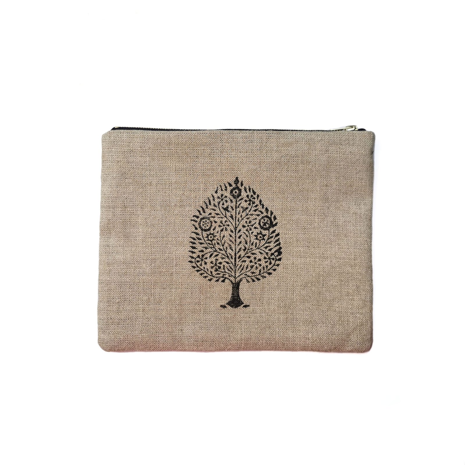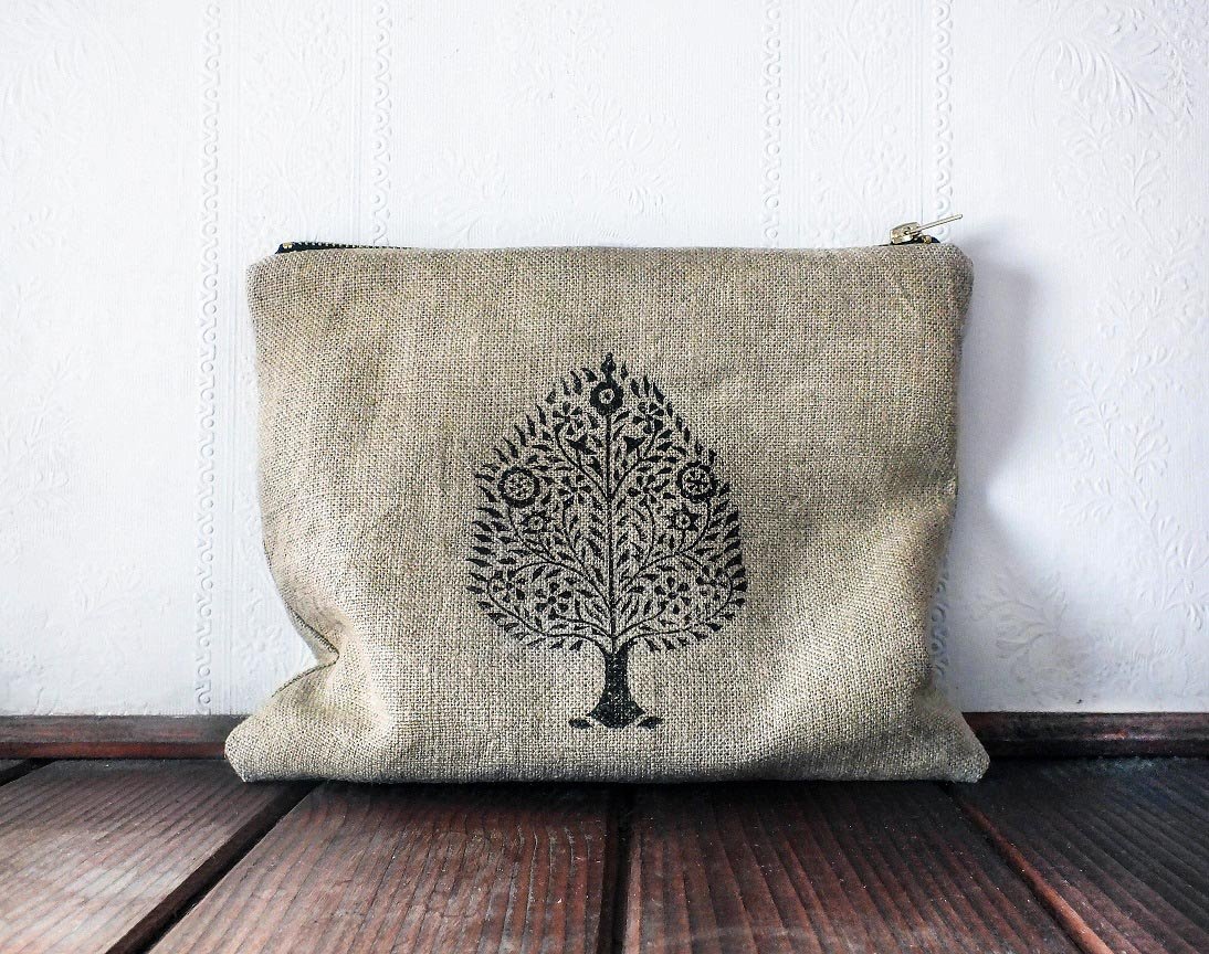 Na przodzie ręcznie wykonany wzór drzewka figowego inspirowany kulturą wschodnią. Zapinany na zamek błyskawiczny w kolorze mosiądzu.