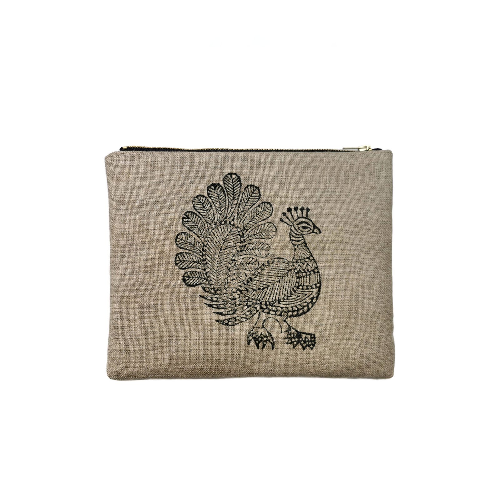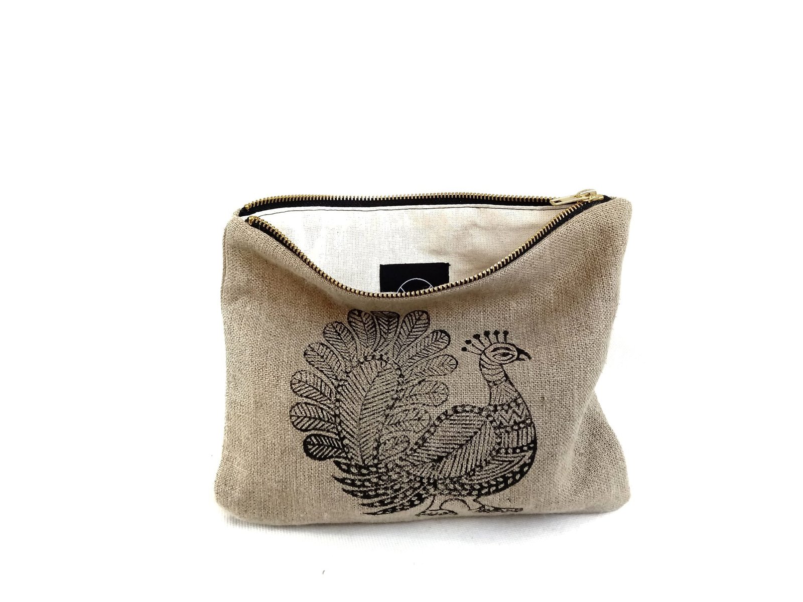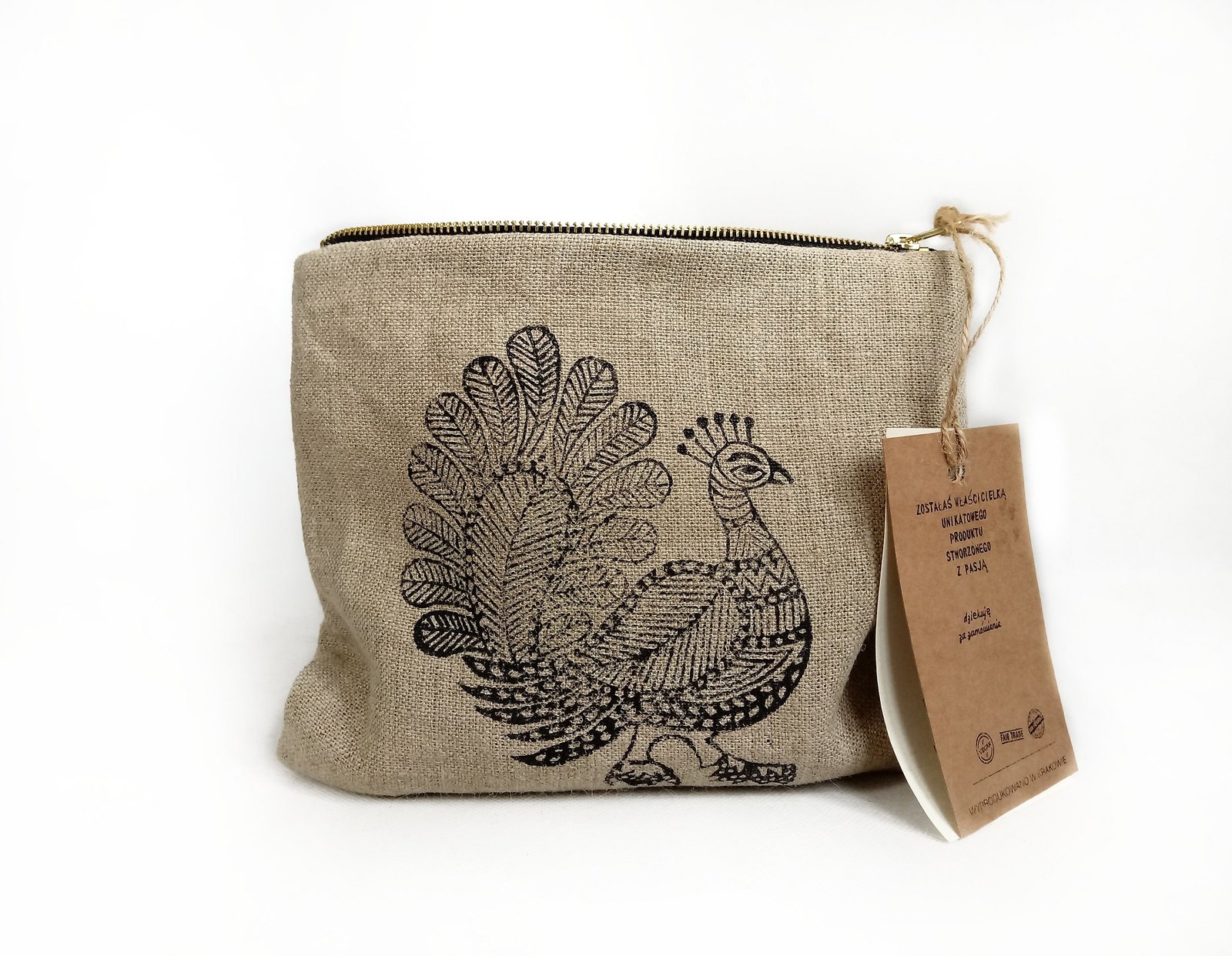 Lniana kosmetyczka z autorskim wzorem pawia.