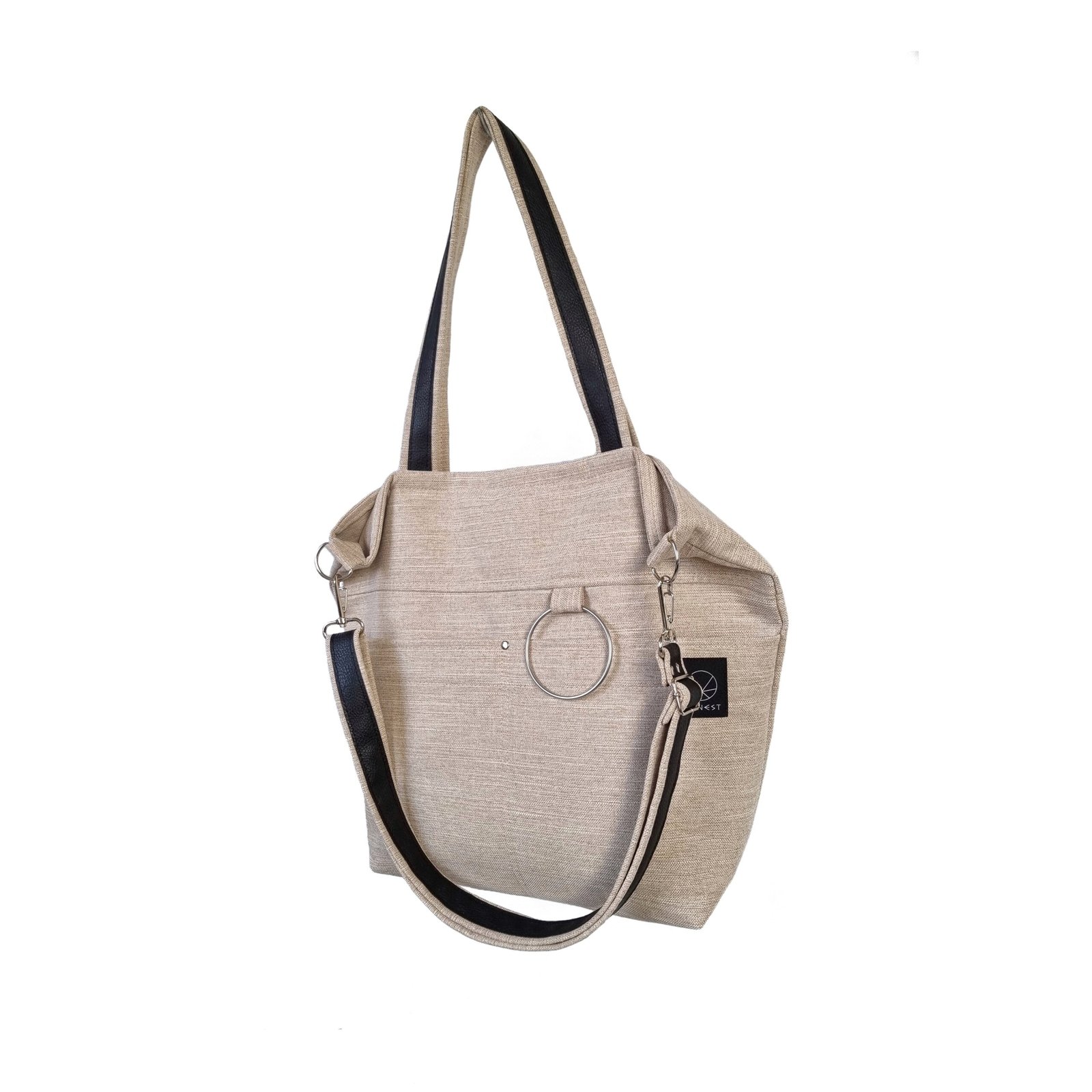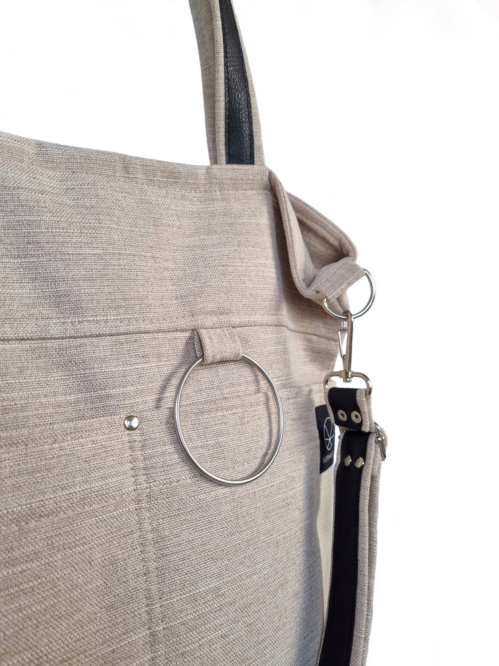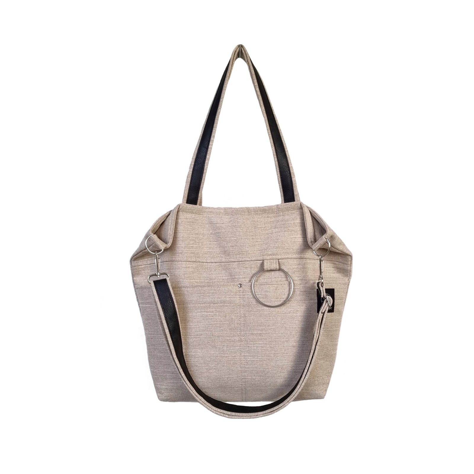 Praktyczna i pojemna torba uszyta z plecionki tapicerskiej w kolorze beżowym. Materiał miękki, mięsisty i miły w dotyku, przypominający tkaninę lnianą.