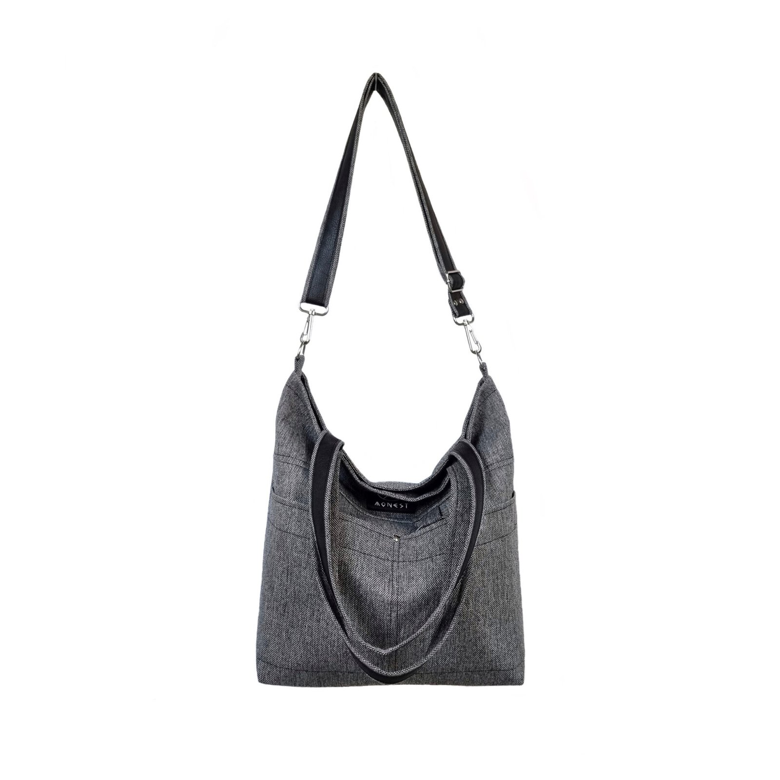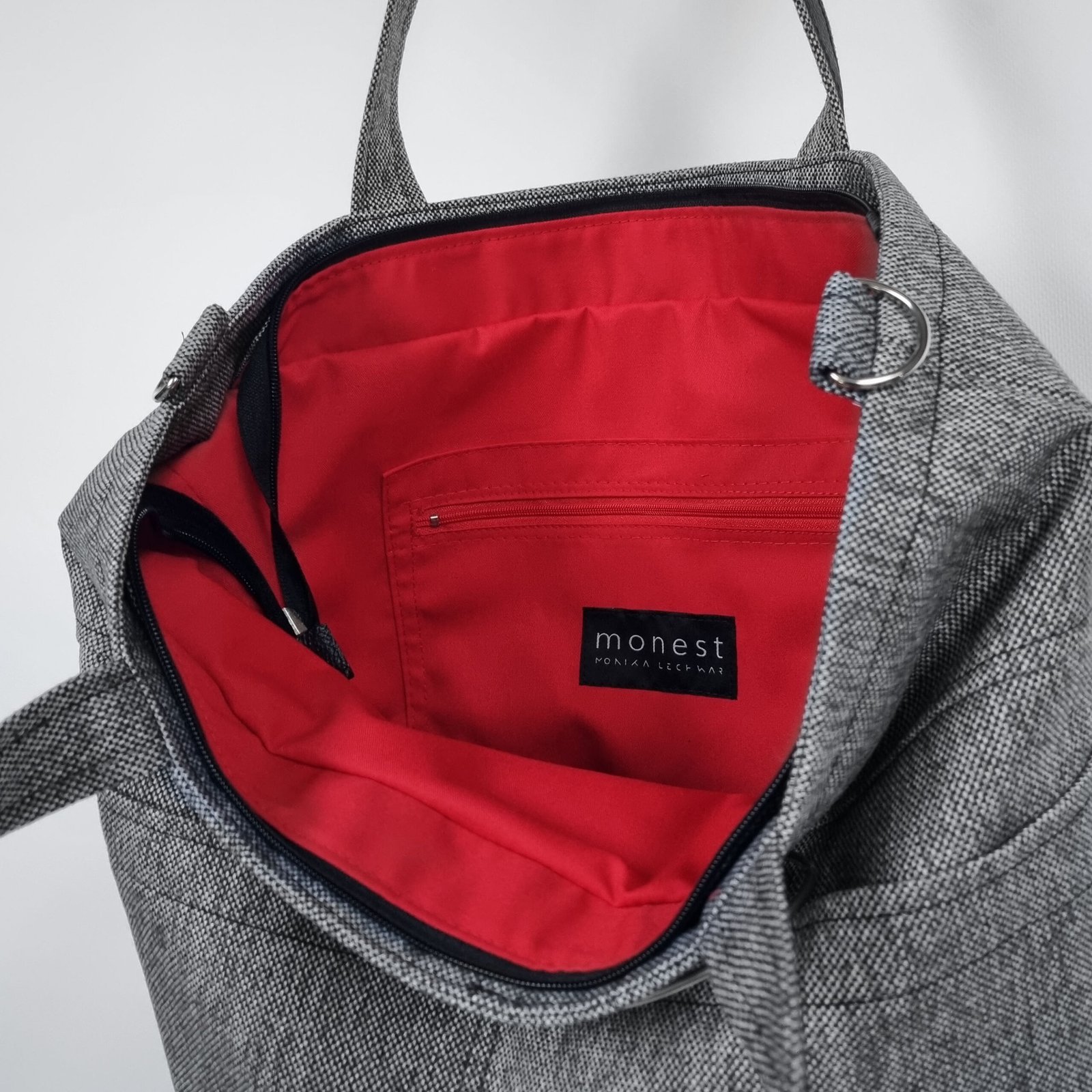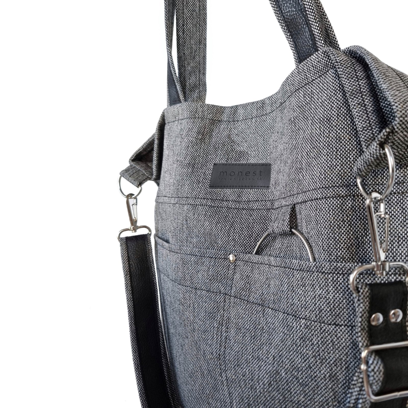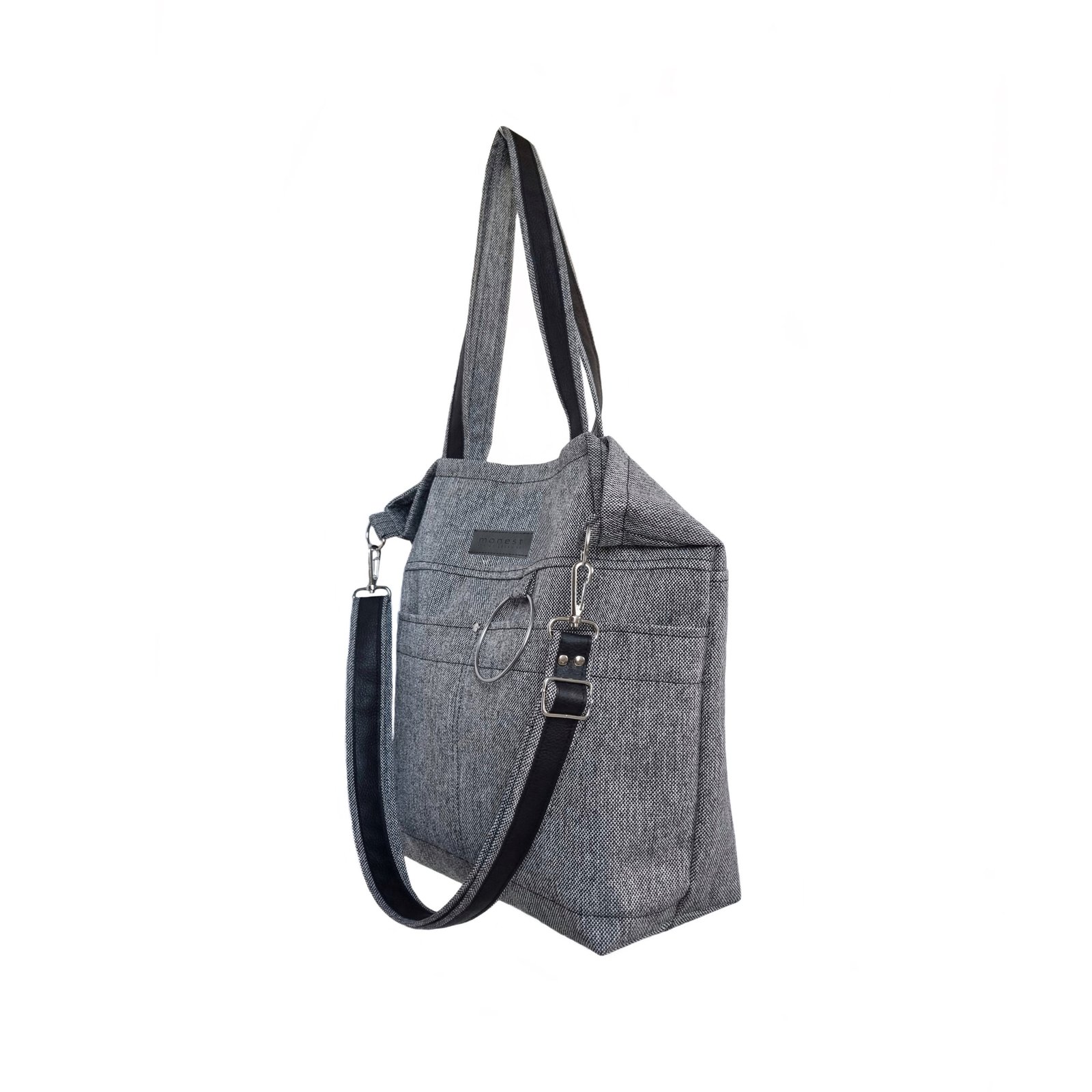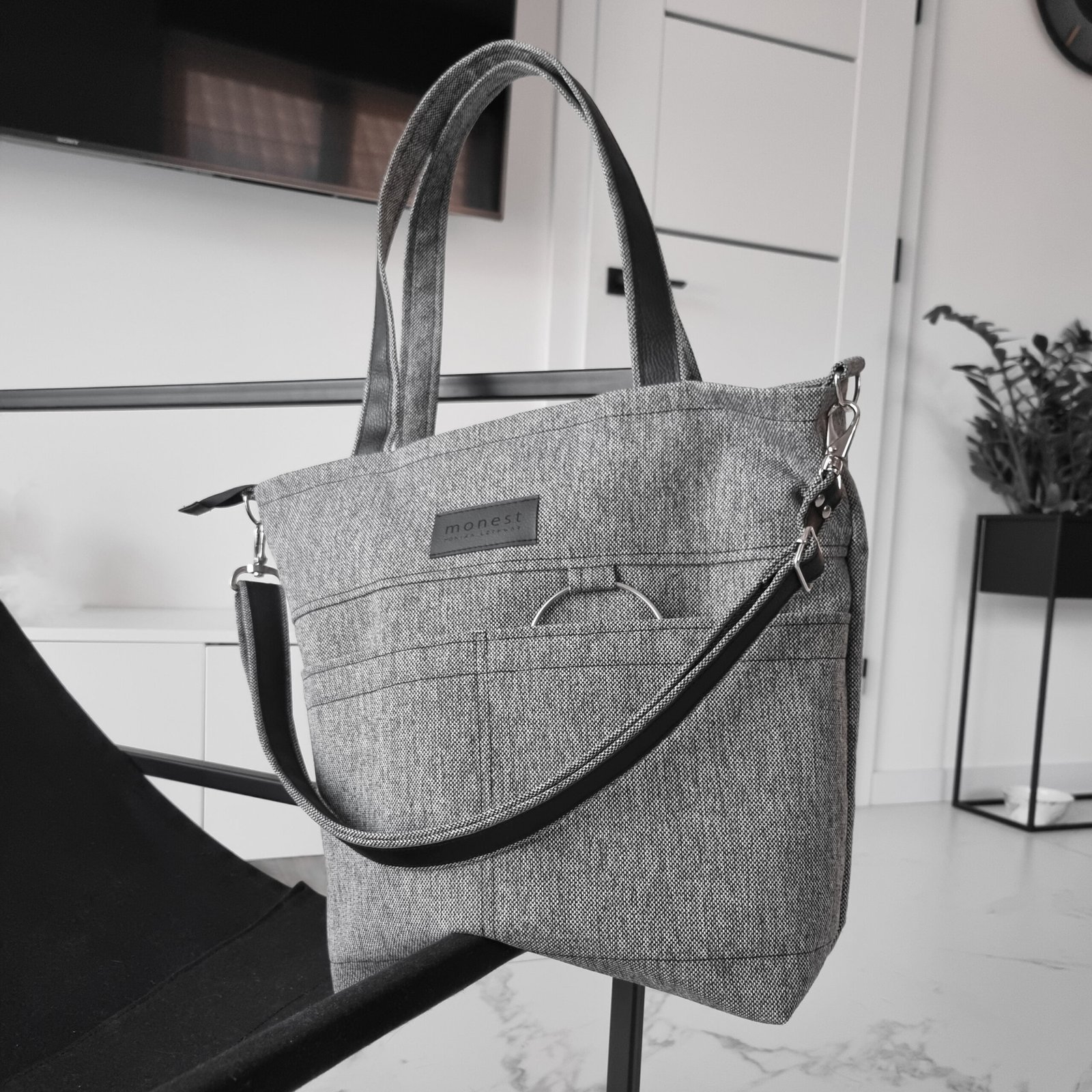 Praktyczna i pojemna torba uszyta z ciemnej melanżowej plecionki tapicerskiej. W środku 3 kieszenie (w tym jedna na zamek). Na przodzie dwie podręczne kieszenie na drobiazgi z charakterystycznym akcentem – ozdobnym ringiem ze stali szlachetnej, do którego można przyczepić klucze lub brelok. Tkanina zasadnicza dodatkowo podszyta materiałem wzmacniającym, który utrudnia wchłanianie wody. Główna komora zapinana na zamek.