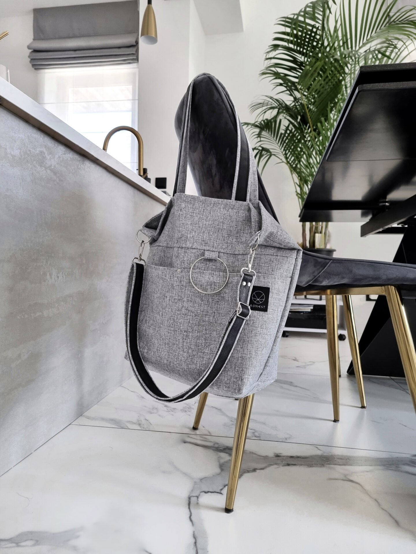 Praktyczna i pojemna torba uszyta z jasno szarej melanżowej plecionki tapicerskiej. W środku 3 kieszenie (w tym jedna na zamek). Na przodzie dwie podręczne kieszenie na drobiazgi z charakterystycznym akcentem – ozdobnym ringiem ze stali szlachetnej, do którego można przyczepić klucze lub brelok. Tkanina zasadnicza podszyta dodatkowo materiałem wzmacniającym, który utrudnia wchłanianie wody. Główna komora zapinana na zamek.