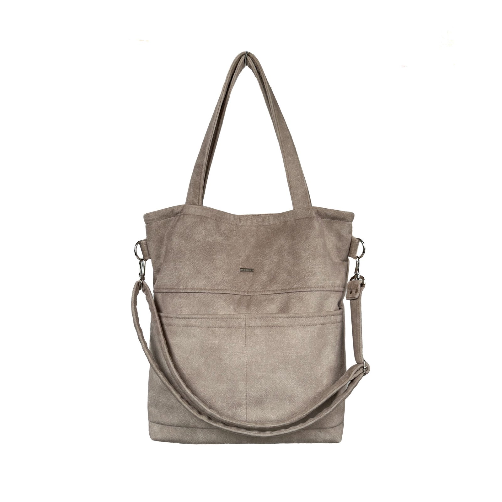 Praktyczna torba na ramię, uszyta z welurowej tkaniny obiciowej w kolorze beżowym. Materiał mięsisty, wytrzymały na uszkodzenia pokryty powłoką water repellent, która utrudnia wchłanianie płynów. Całość zapinana na suwak. Wewnątrz 3 kieszenie w tym jedna na zamek.