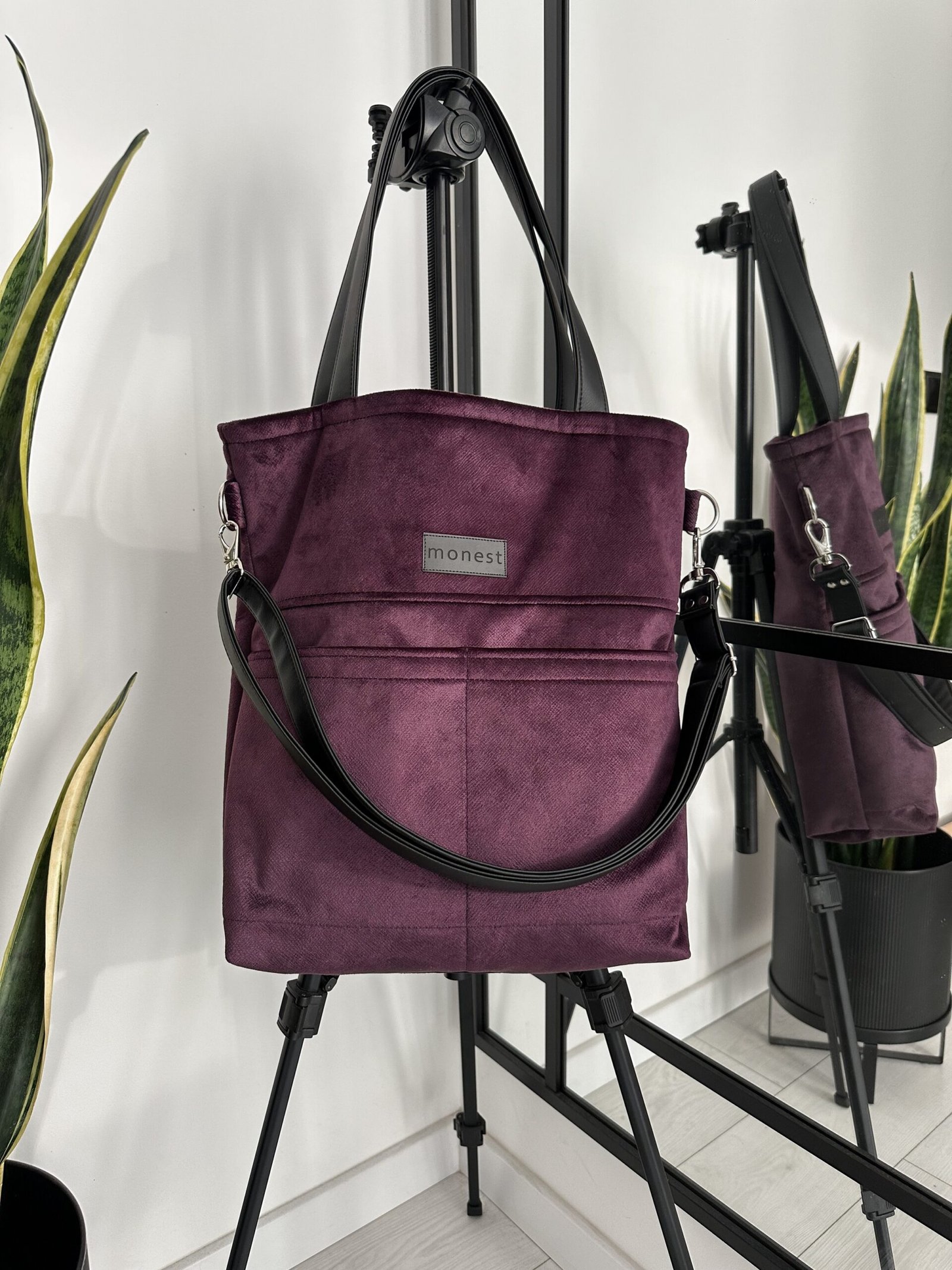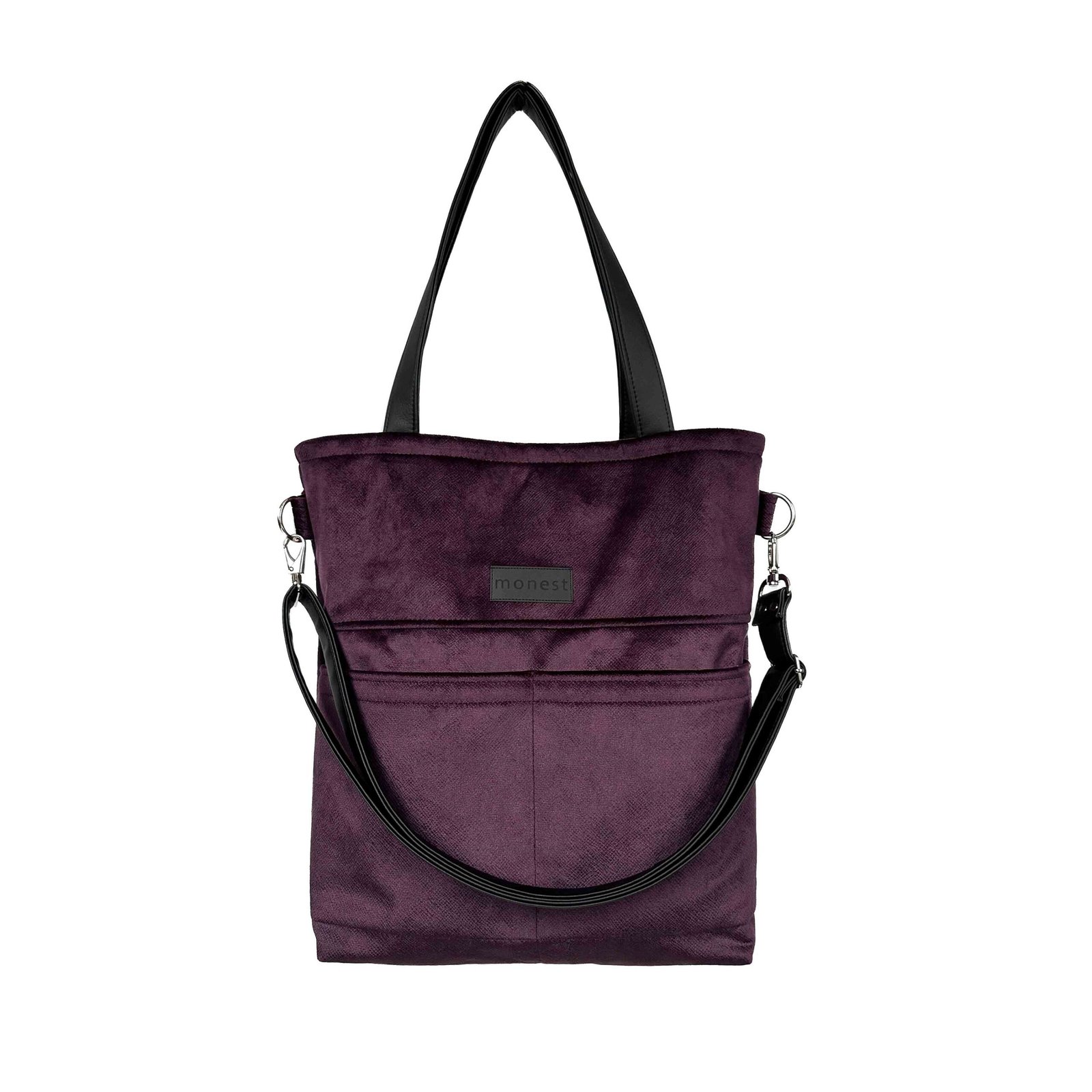 Praktyczna torba na ramię, uszyta z welurowej tkaniny obiciowej w kolorze głębokiego fioletu. Materiał mięsisty, wytrzymały na uszkodzenia pokryty powłoką water repellent, która utrudnia wchłanianie płynów. Całość zapinana na suwak. Wewnątrz 3 kieszenie w tym jedna na zamek.