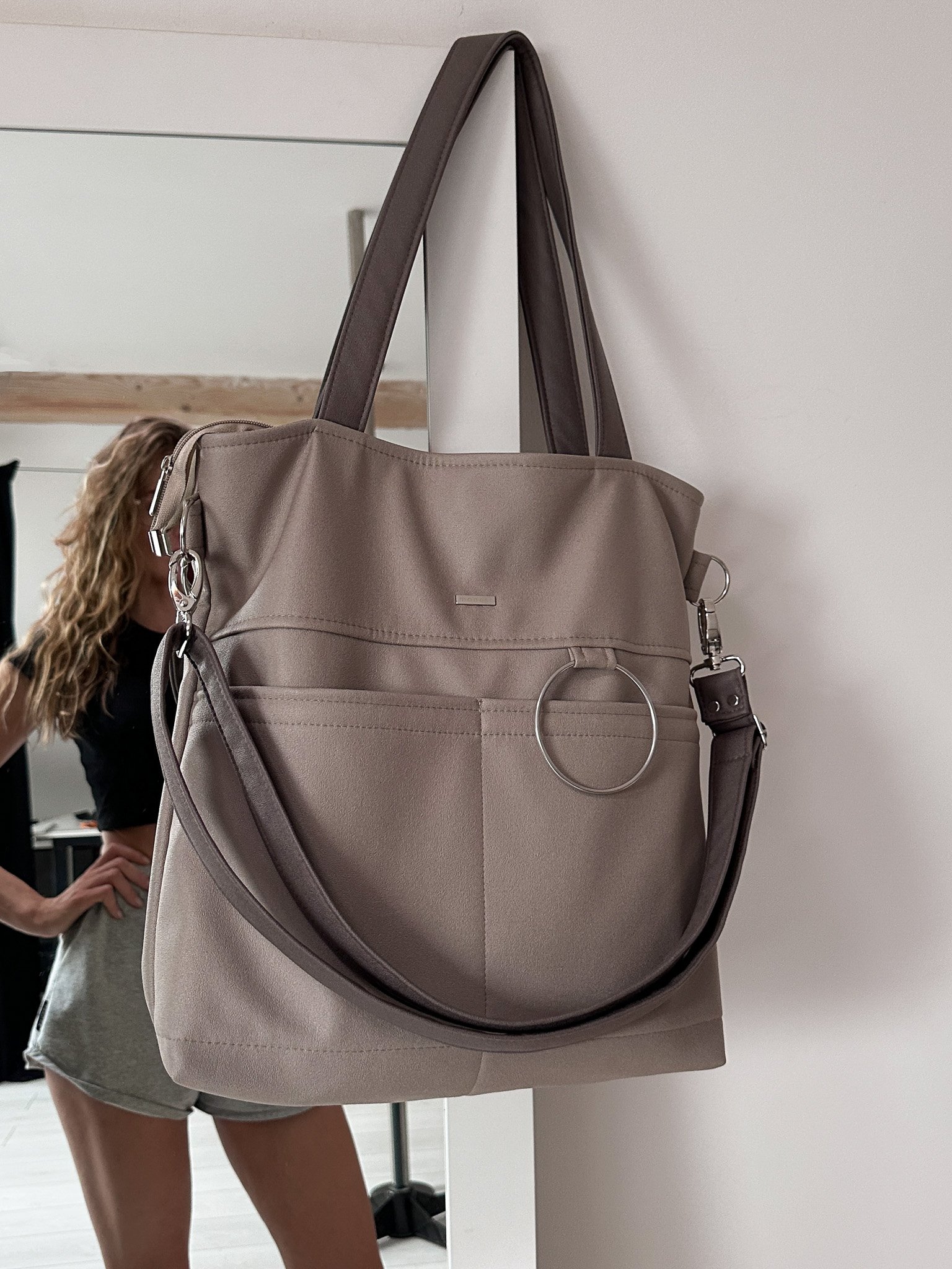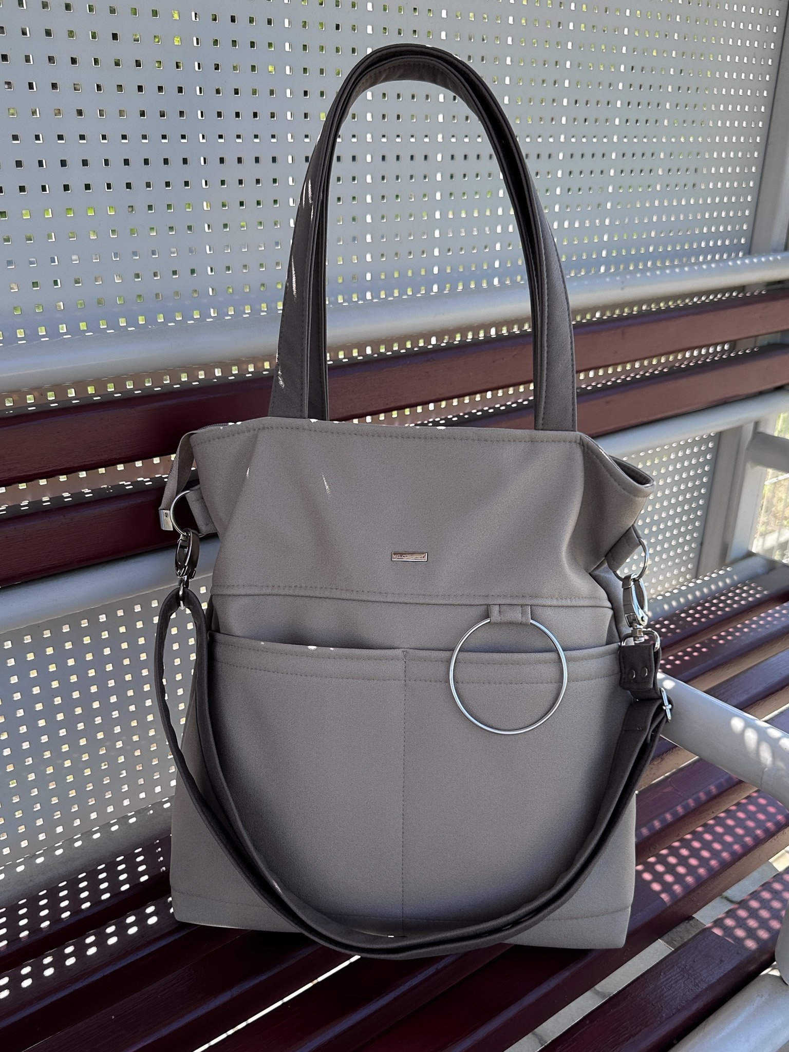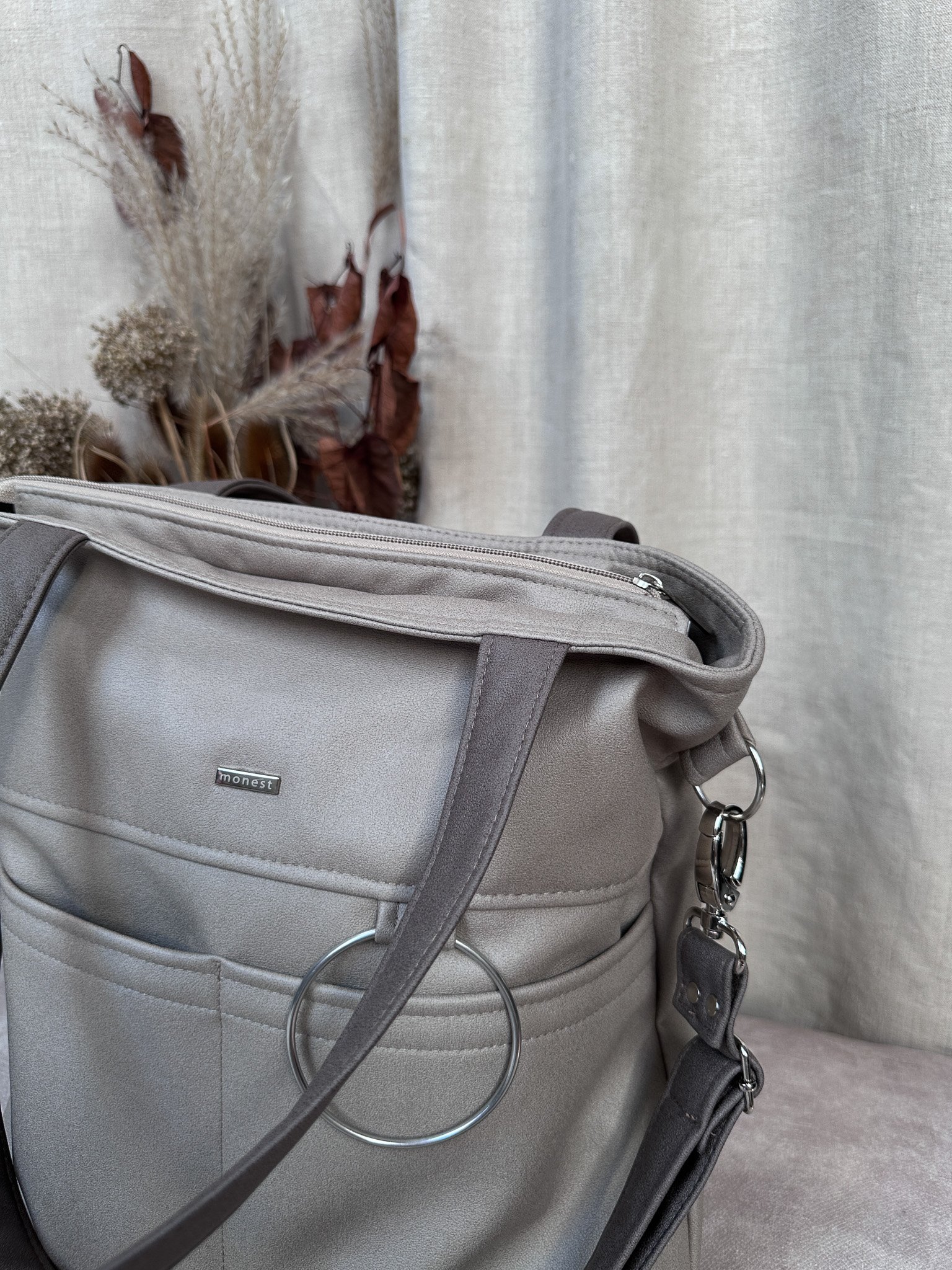 Uszyta z miękkiej, a zarazem wytrzymałej tkaniny tapicerskiej w odcieniu beżowo-szarym, który niczym kameleon zmienia się w zależności od światła — raz wpada w ciepły beż, innym razem w szarość. Całość zapinana na zamek. Na przodzie dwie podręczne kieszenie z ringiem ze stali szlachetnej, do którego można zaczepić klucze lub ulubiony brelok. W środku 3 kieszenie w tym jedna na zamek.