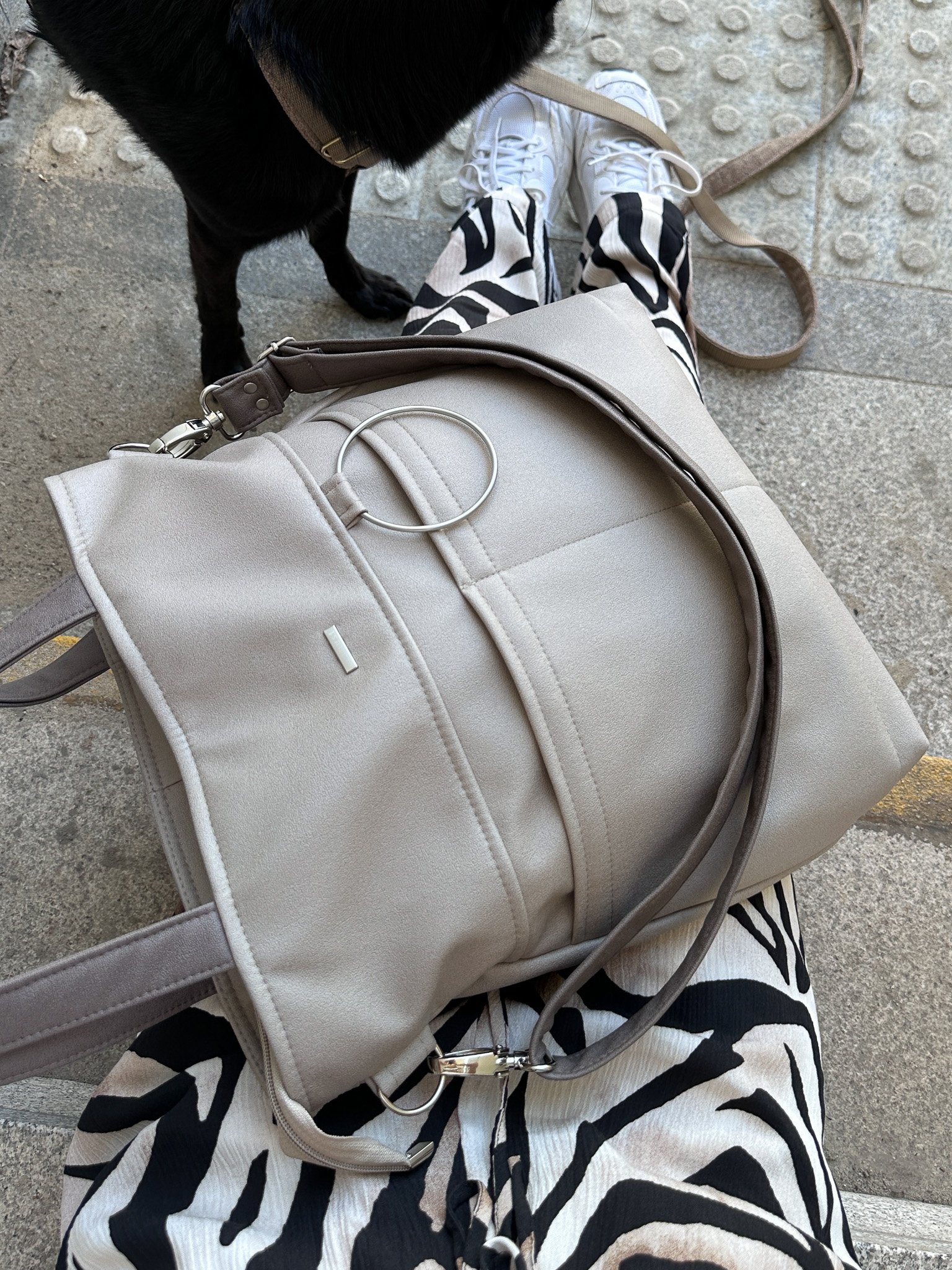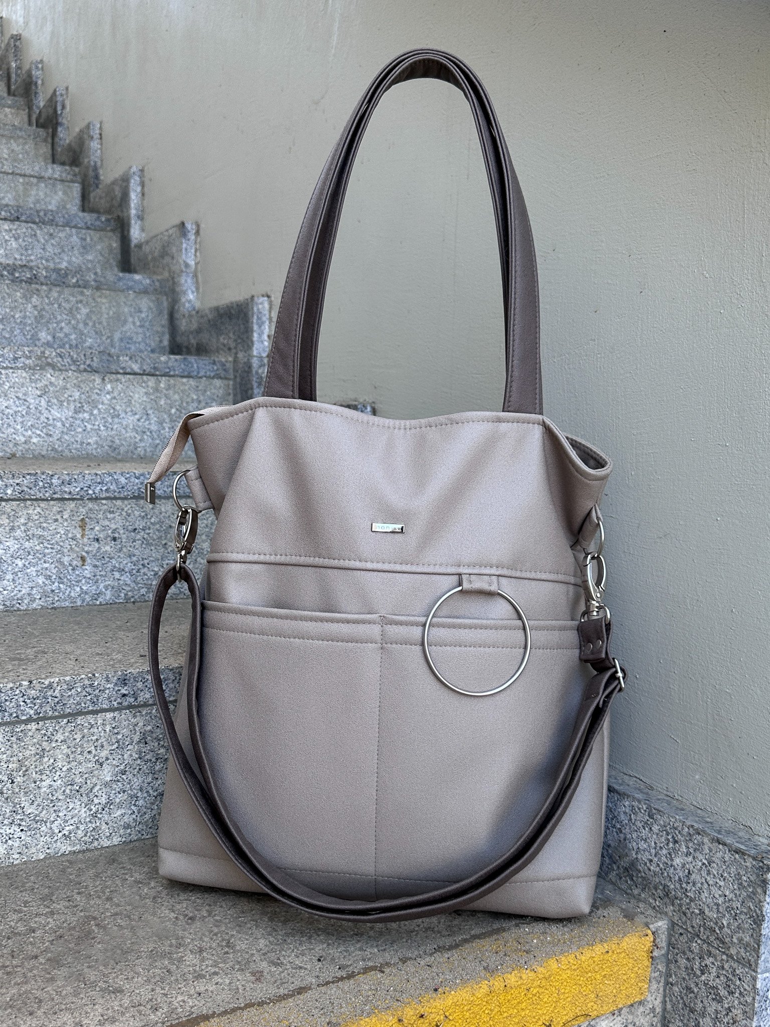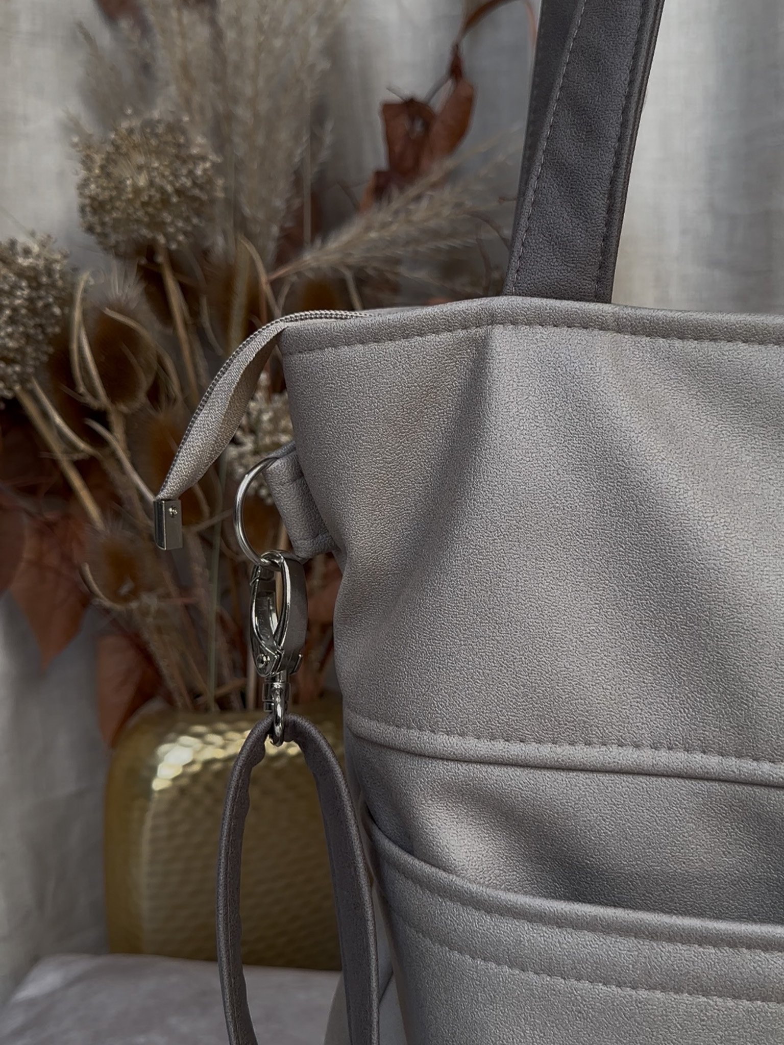 Uszyta z miękkiej, a zarazem wytrzymałej tkaniny tapicerskiej w odcieniu beżowo-szarym, który niczym kameleon zmienia się w zależności od światła — raz wpada w ciepły beż, innym razem w szarość. Całość zapinana na zamek. Na przodzie dwie podręczne kieszenie z ringiem ze stali szlachetnej, do którego można zaczepić klucze lub ulubiony brelok. W środku 3 kieszenie w tym jedna na zamek.