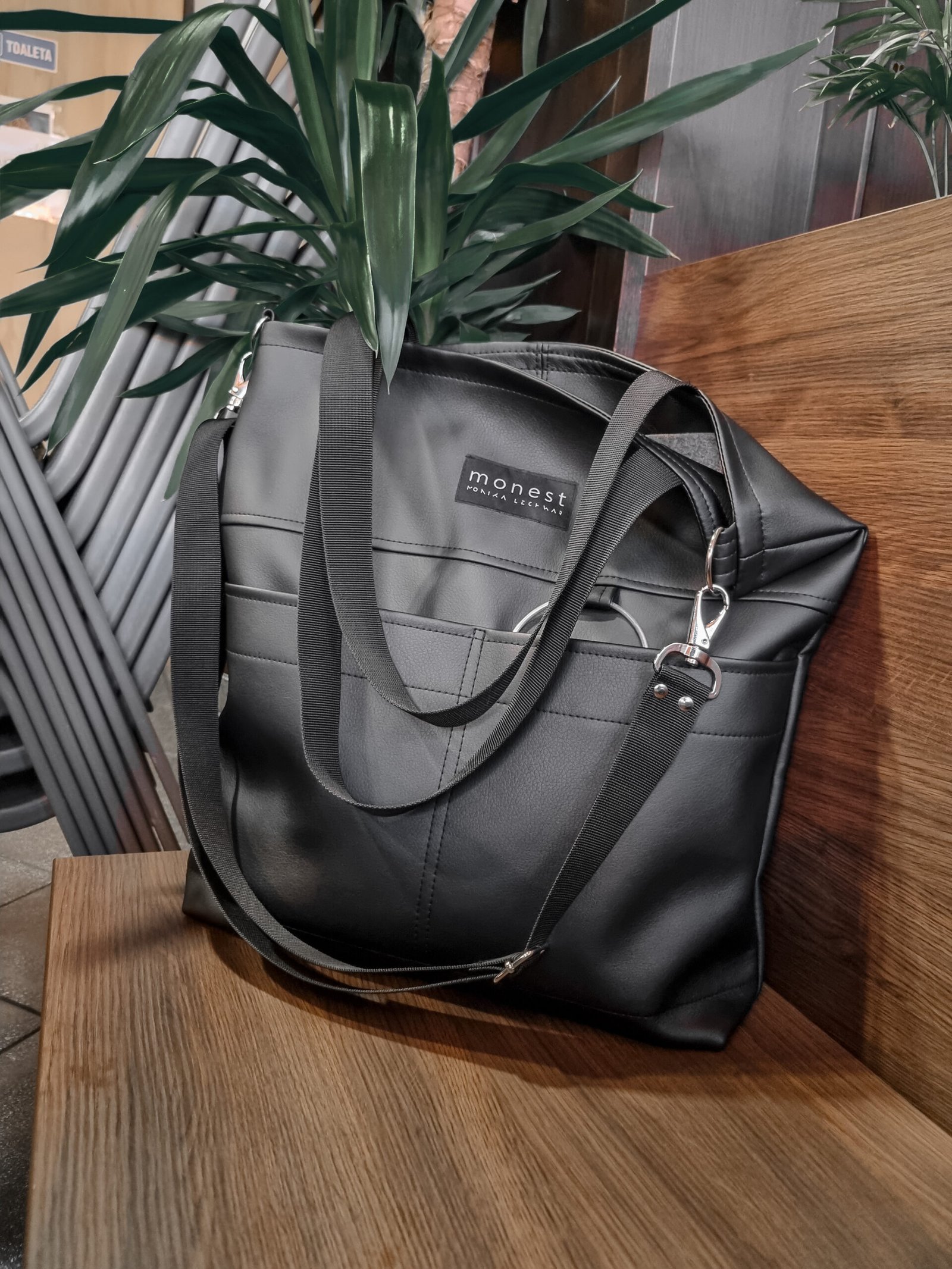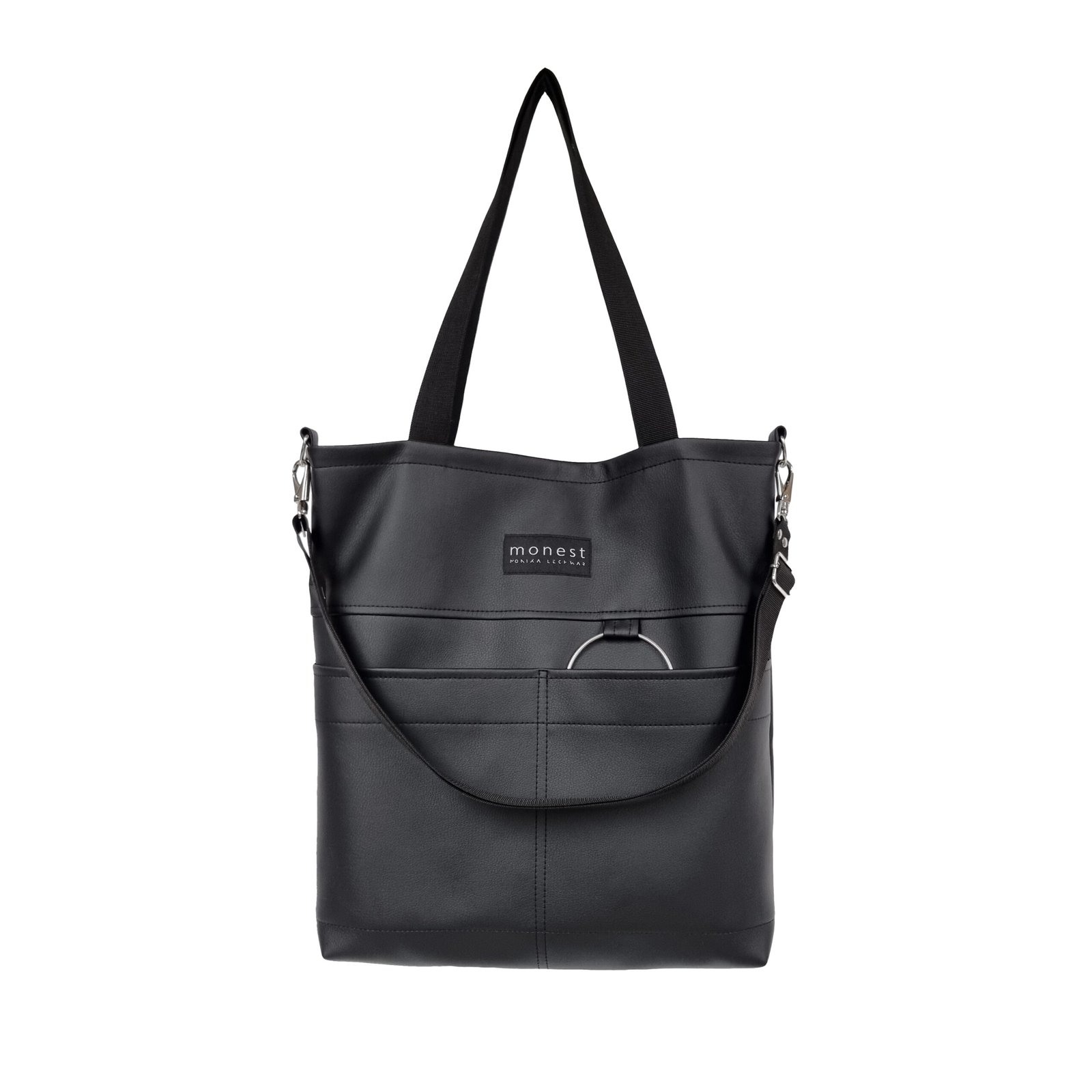 Praktyczna czarna torba na ramię, uszyta z bardzo miękkiej, nieprzemakalnej eko skóry. Materiał jest matowy i gładki w dotyku. Na przodzie dwie podręczne kieszenie z ringiem ze stali szlachetnej, do którego można zaczepić klucze lub ulubiony brelok.