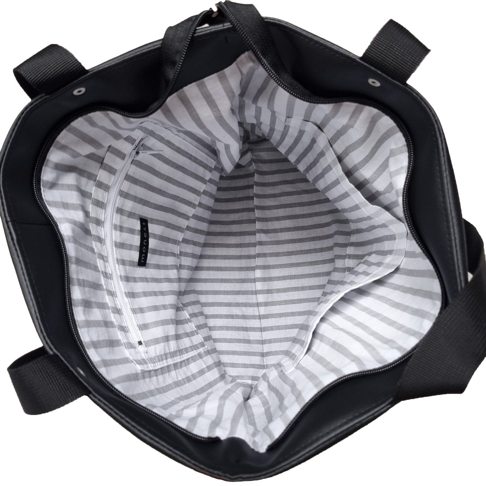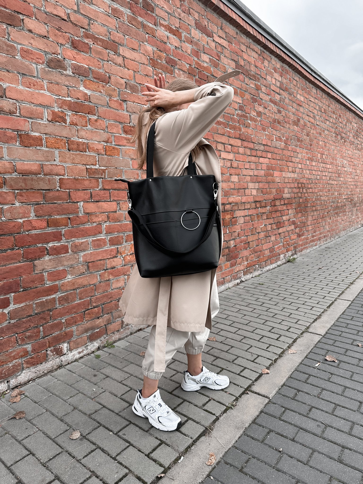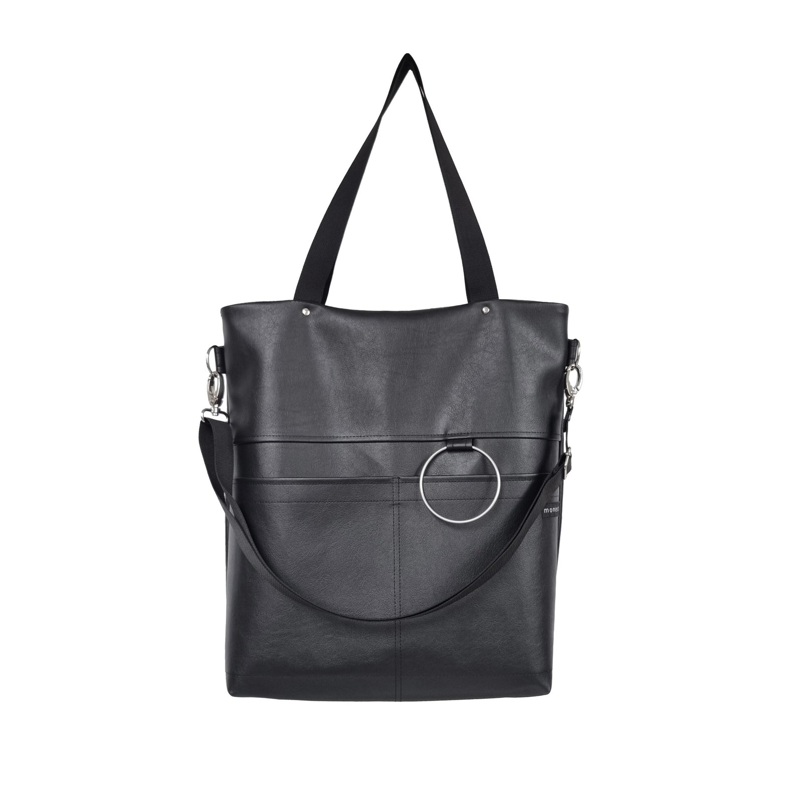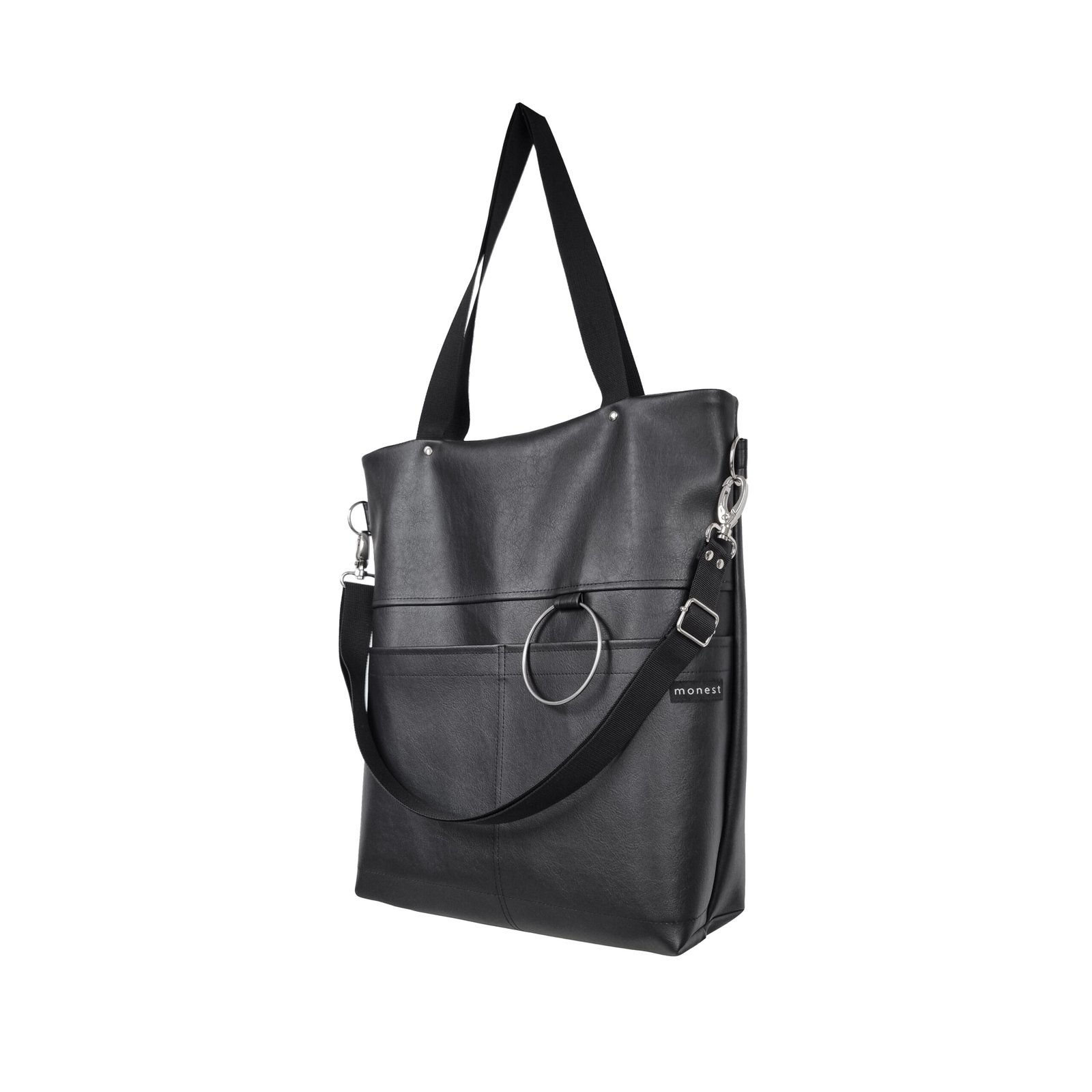 Praktyczna czarna torba na ramię, uszyta z wytrzymałej eko skóry. Całość zapinana na zamek. Na przodzie dwie podręczne kieszenie z ringiem ze stali szlachetnej, do którego można zaczepić klucze.