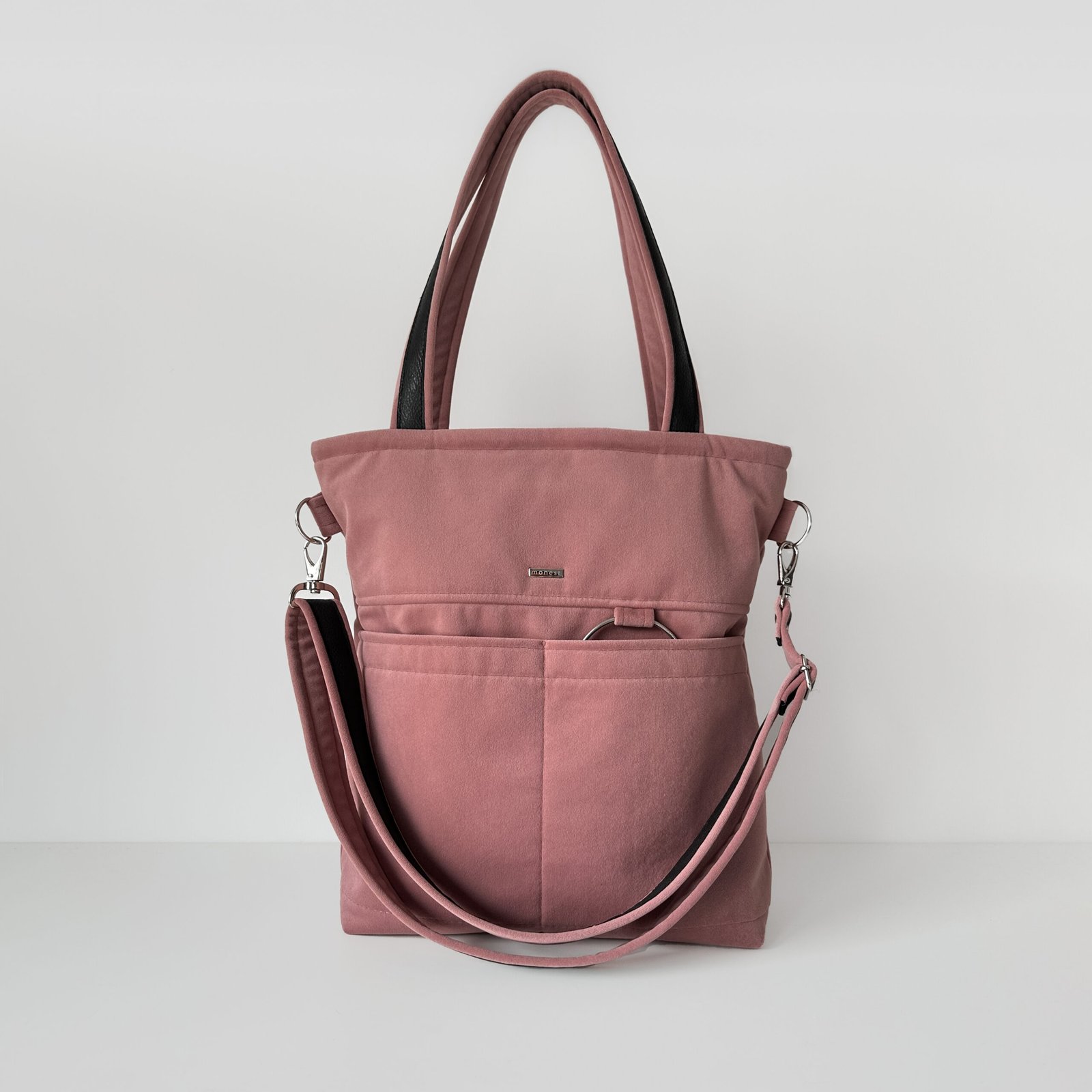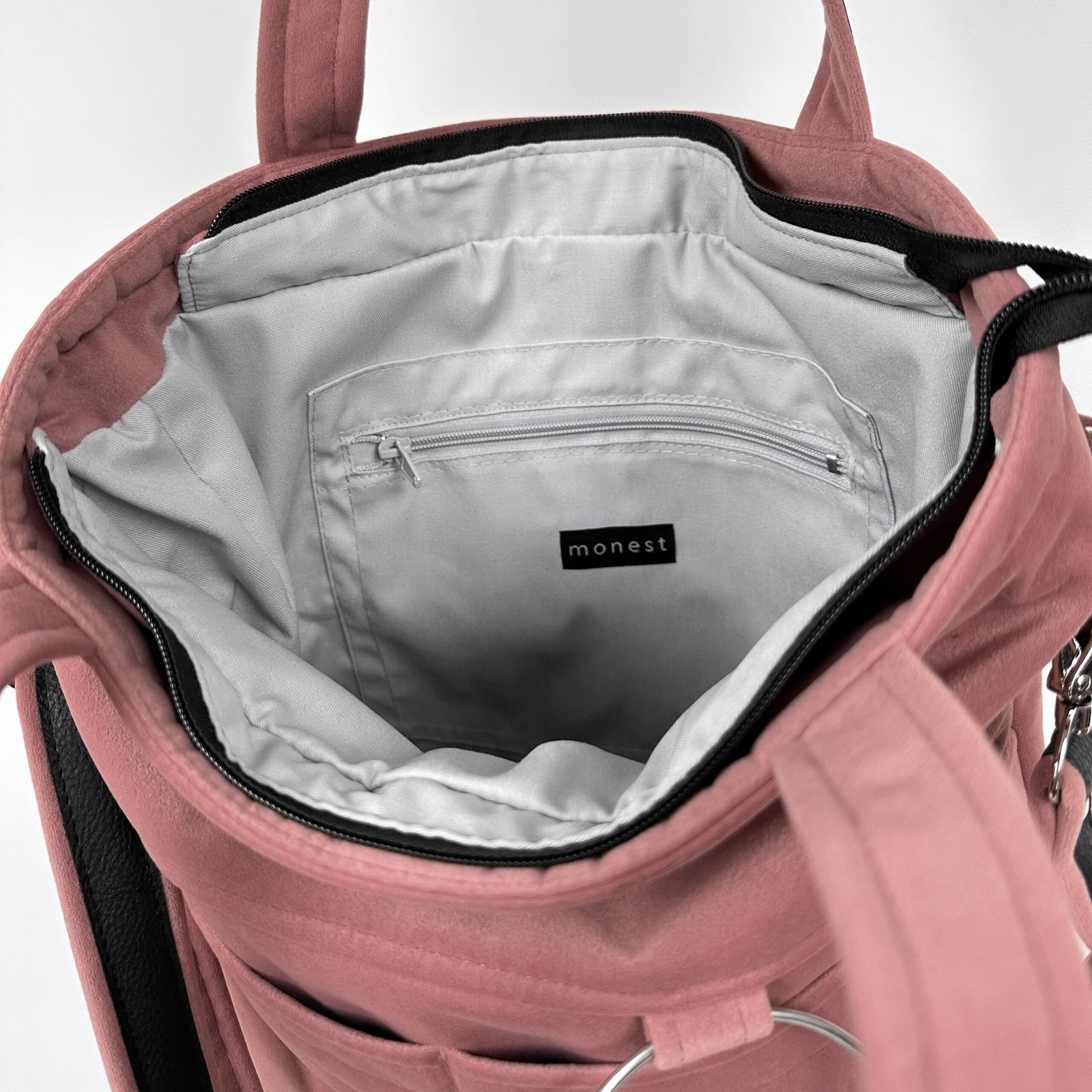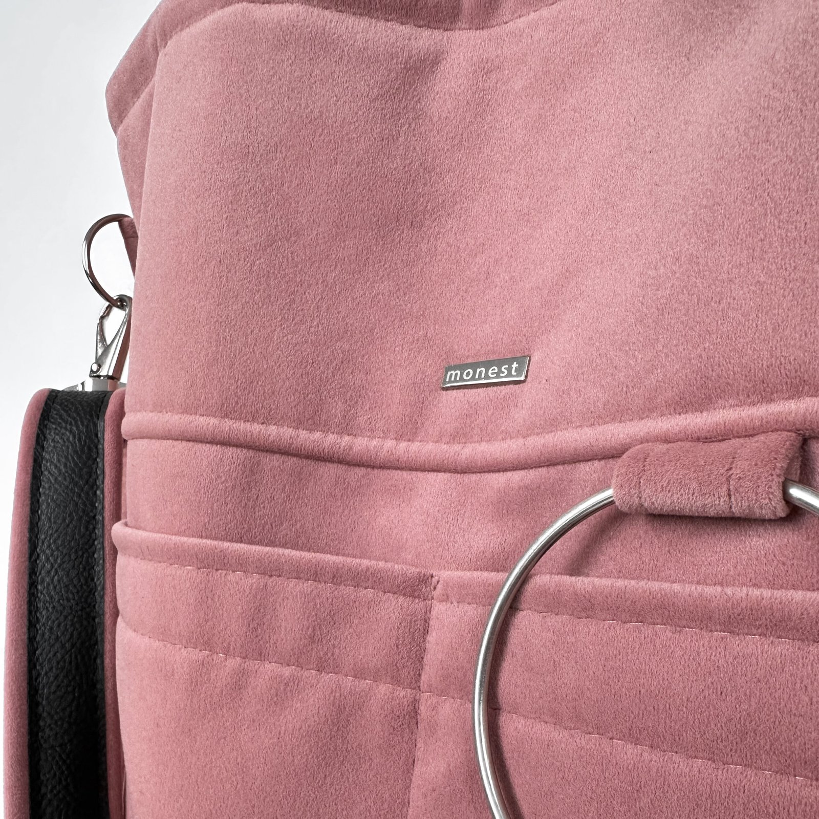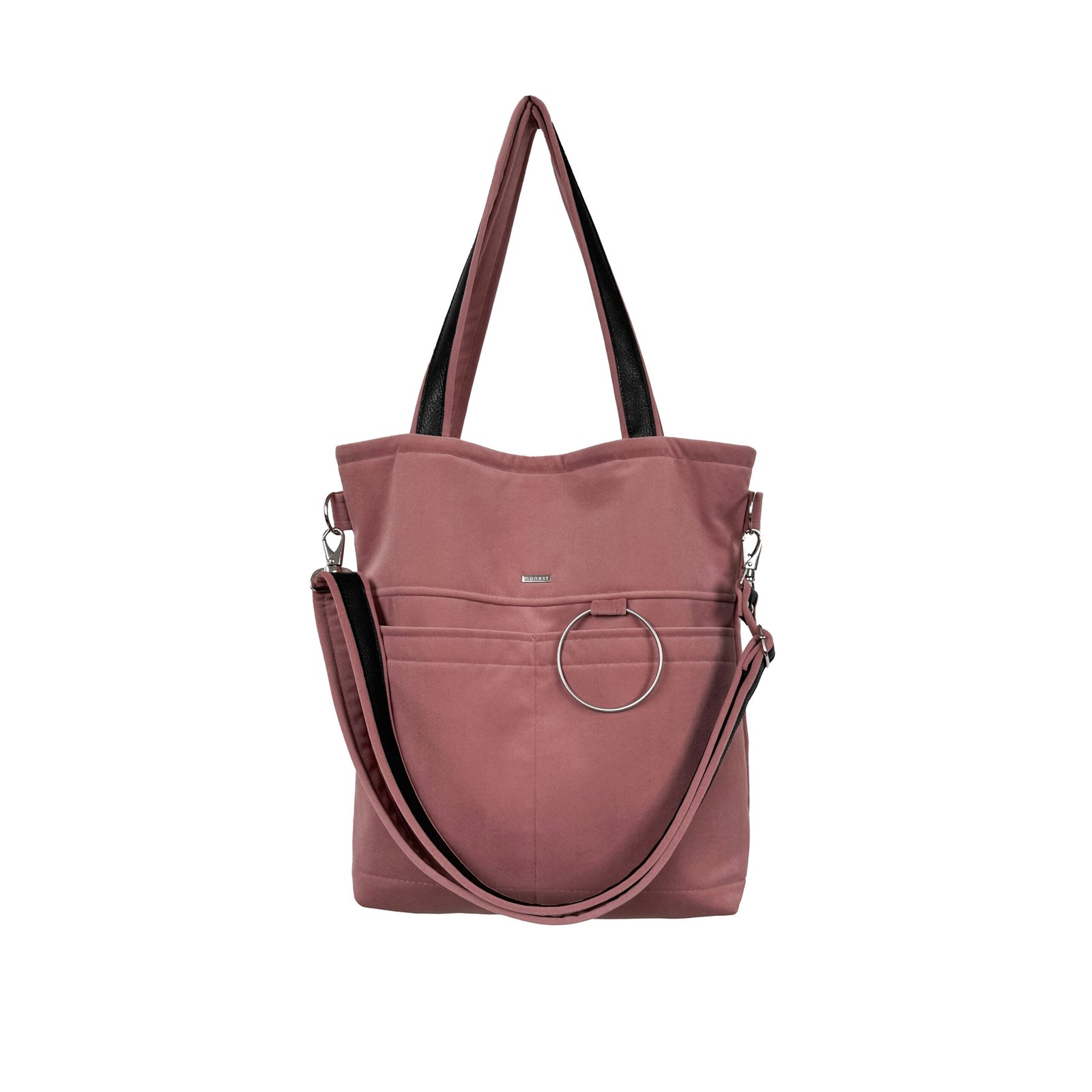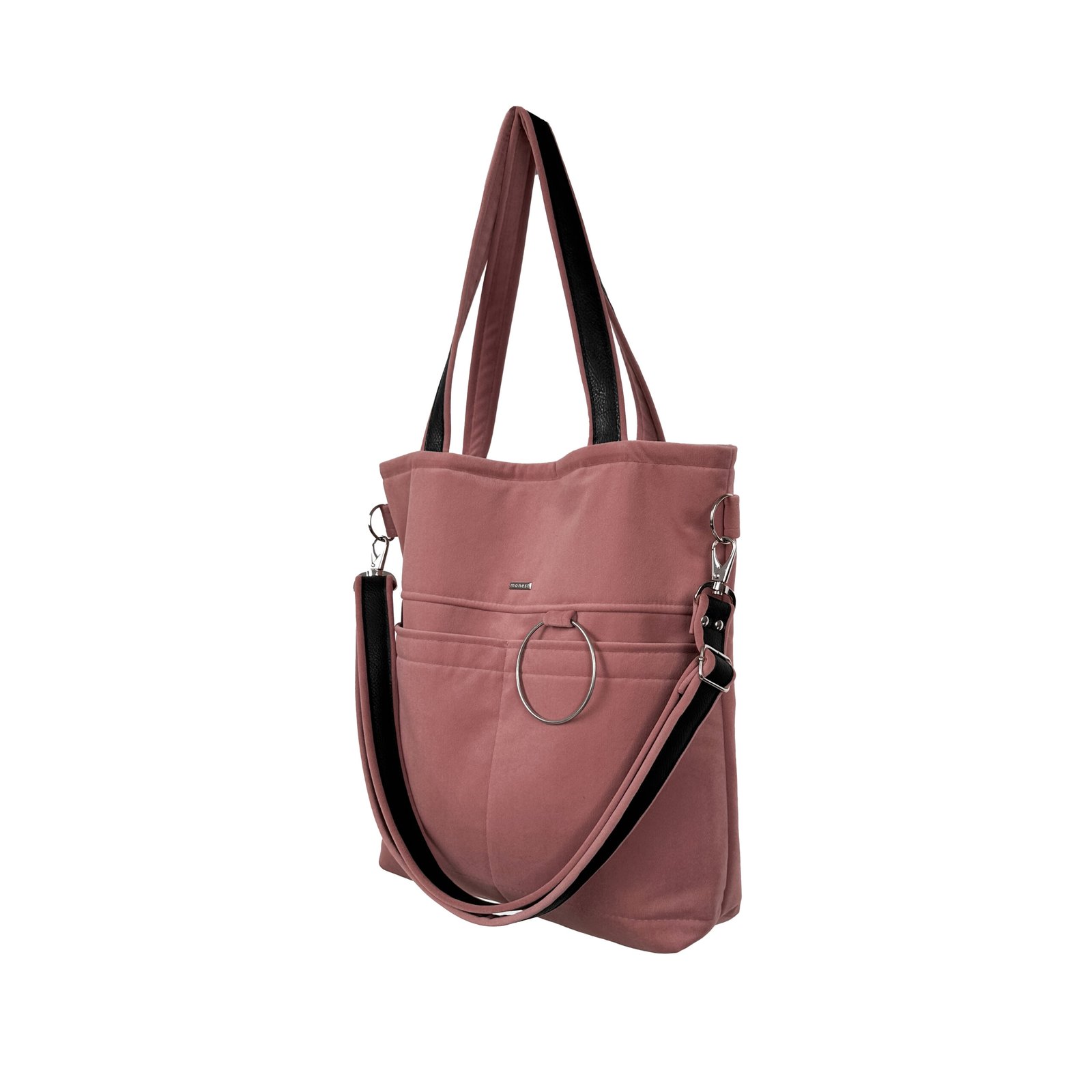 Praktyczna torba na ramię, uszyta z welurowej tkaniny obiciowej w kolorze indyjskiego różu. Materiał mięsisty, wytrzymały na uszkodzenia pokryty powłoką water repellent, która utrudnia wchłanianie płynów. Na przodzie dwie podręczne kieszenie z ringiem ze stali szlachetnej, do którego można zaczepić klucze. Całość zapinana na suwak.