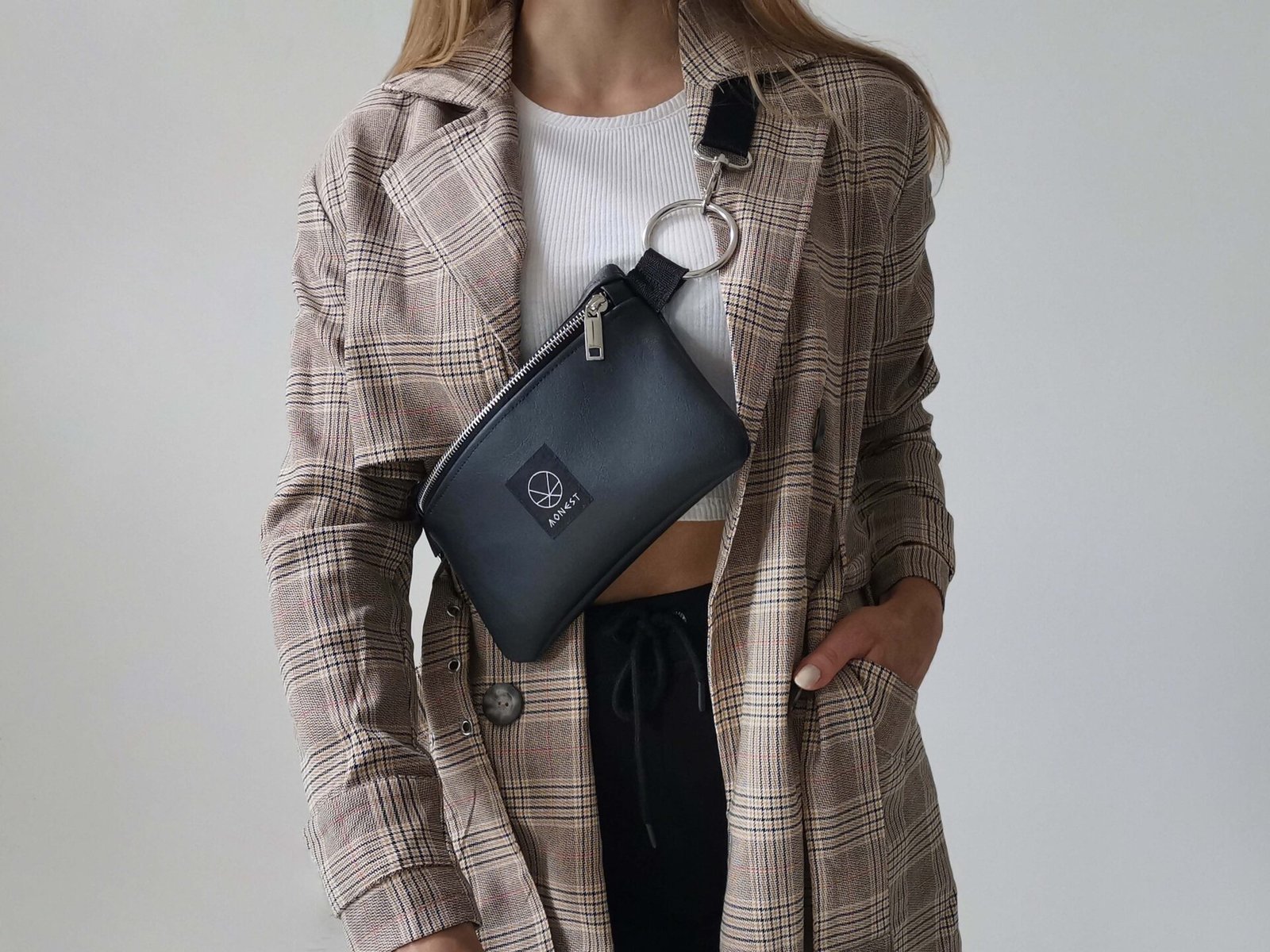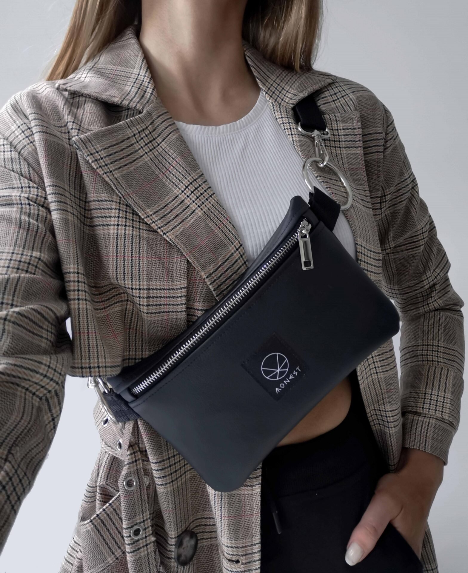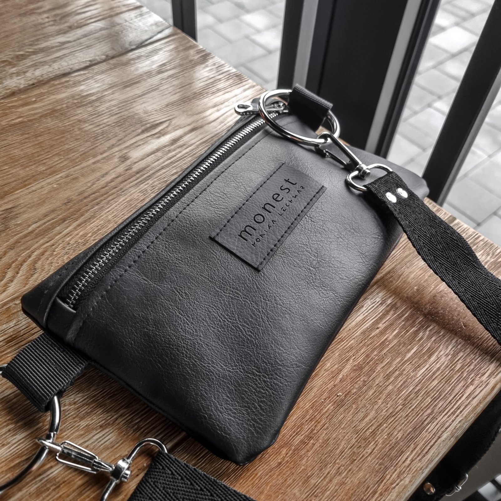 Mała czarna kompaktowa nerka ze srebrnymi akcentami. Posiada jedną komorę zamykaną na zamek. Torebka wykonana jest z wysokiej jakości skóry ekologicznej odpornej na wodę i bawełnianej podszewki. Spokojnie zmieści niewielki portfelik, klucze oraz telefon. Długość paska jest regulowana, dzięki czemu saszetkę można nosić na skos przez ramię – jak listonoszkę, na ramieniu lub na biodrze.