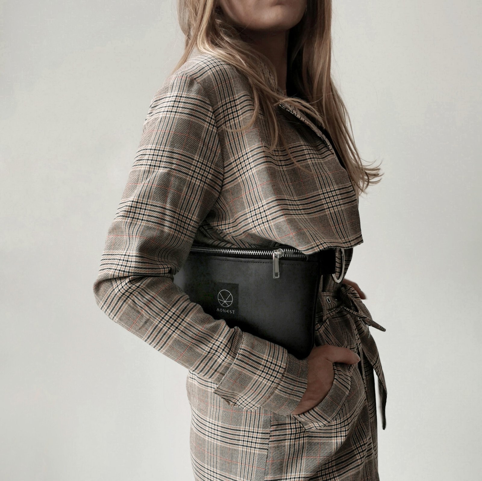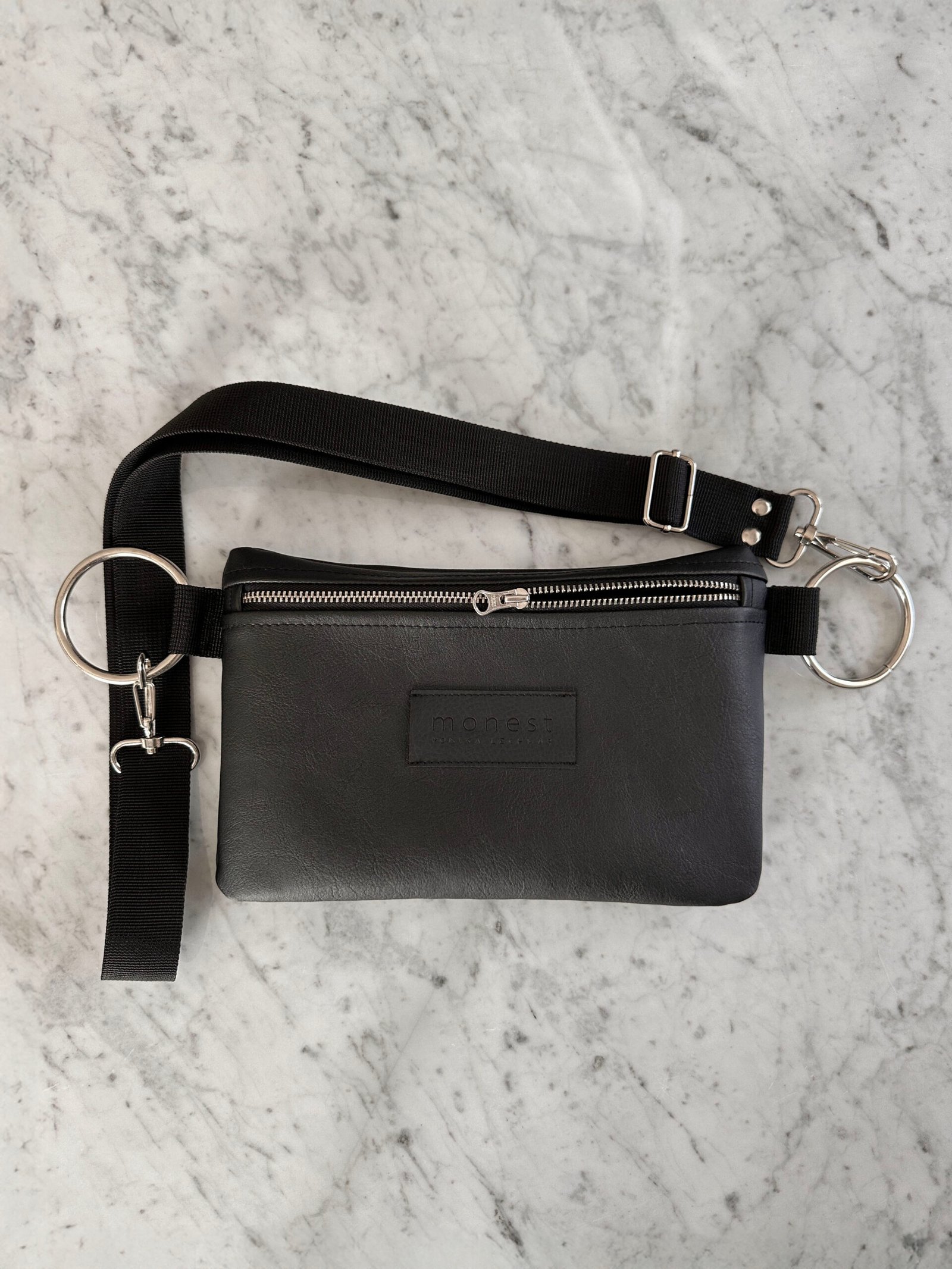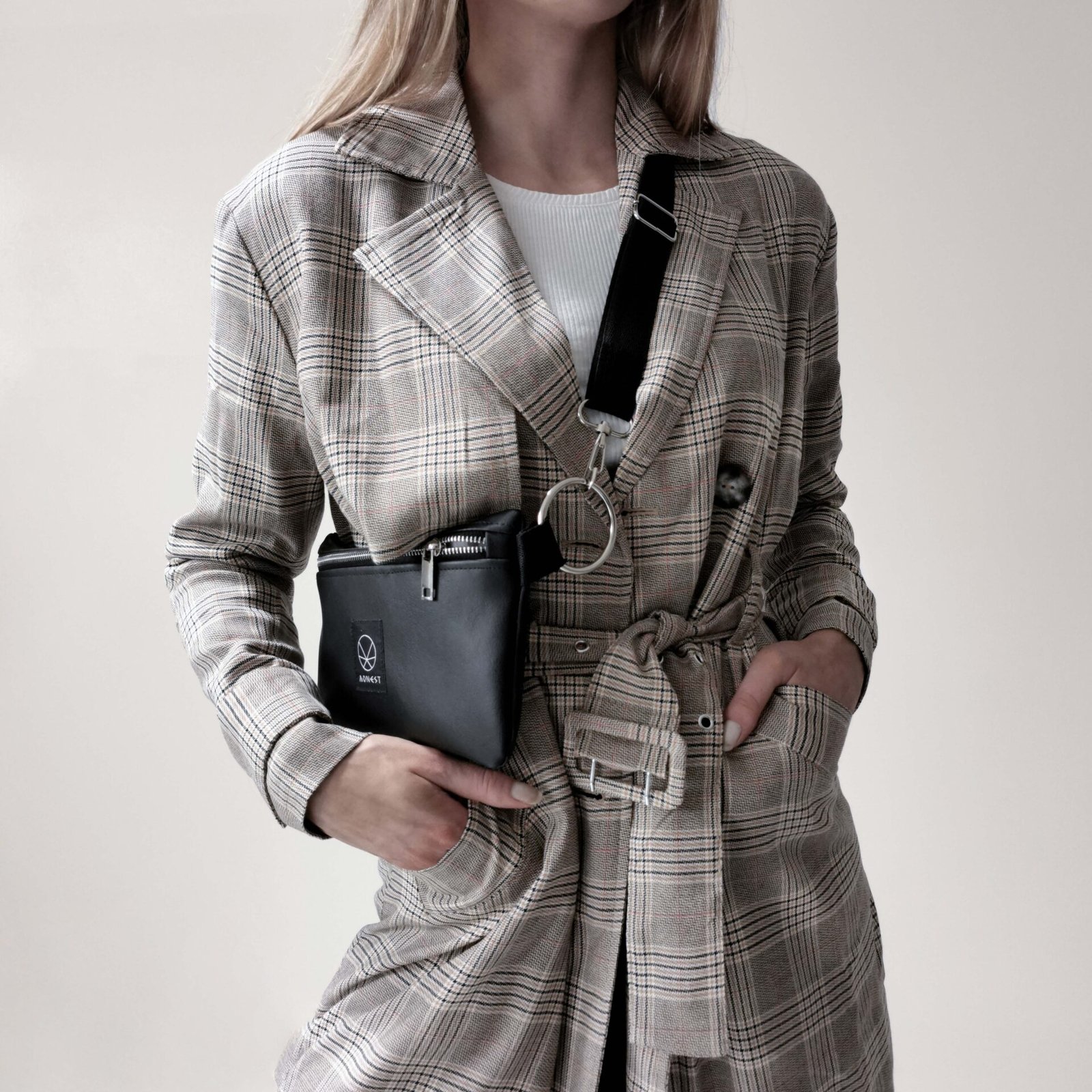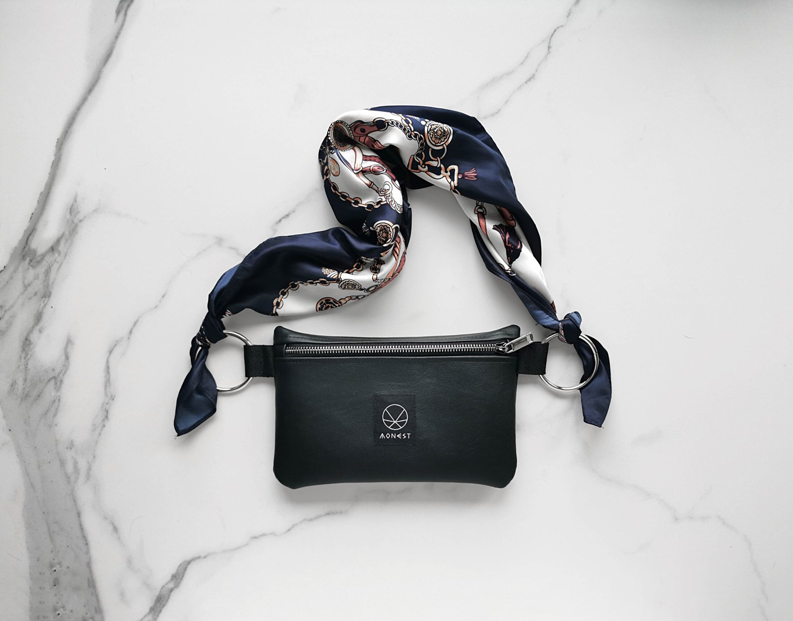 Mała czarna kompaktowa nerka ze srebrnymi akcentami. Posiada jedną komorę zamykaną na zamek. Torebka wykonana jest z wysokiej jakości skóry ekologicznej odpornej na wodę i bawełnianej podszewki. Spokojnie zmieści niewielki portfelik, klucze oraz telefon. Długość paska jest regulowana, dzięki czemu saszetkę można nosić na skos przez ramię – jak listonoszkę, na ramieniu lub na biodrze.