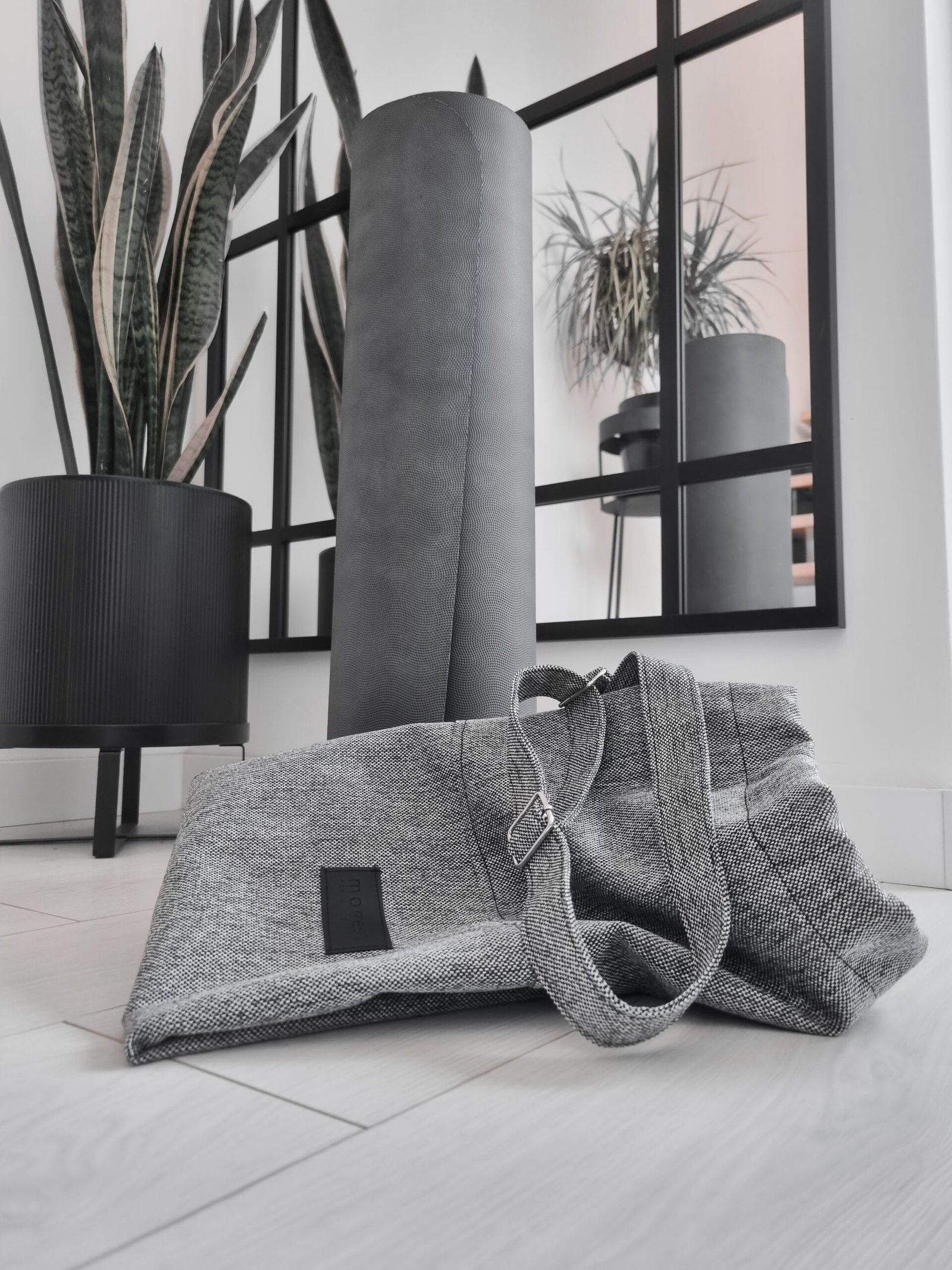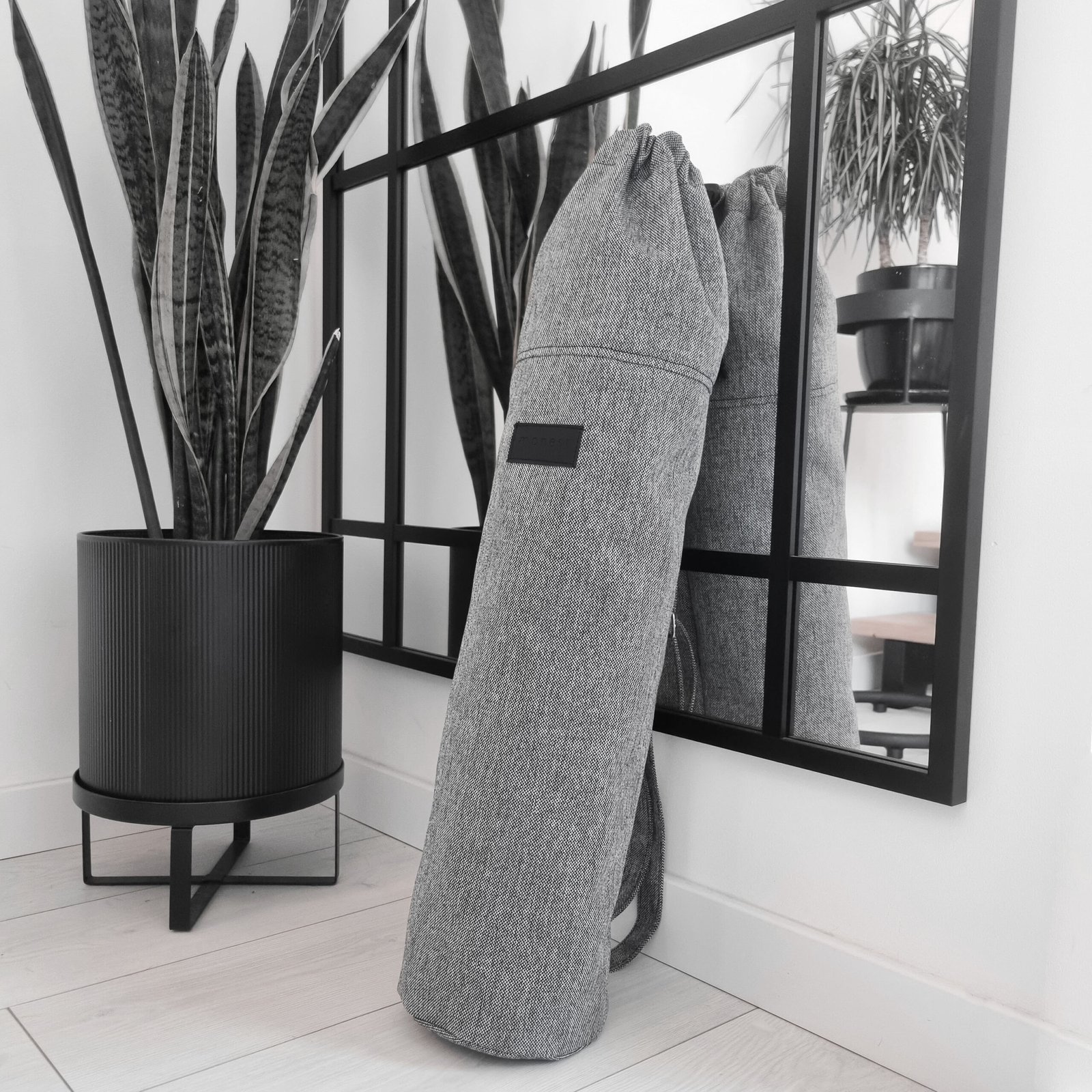 Pokrowiec na matę do jogi uszyty z wytrzymałej tkaniny tapicerskiej o splocie płóciennym. Wnętrze wykończone bawełnianą podszewką z kieszonką na drobiazgi. Wygodny regulowany pasek o szerokości 3 cm. Torba jest prosta i funkcjonalna.