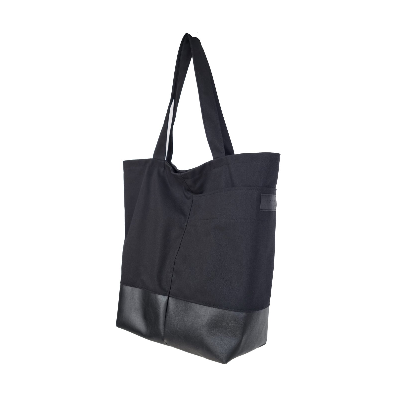 Duża, pojemna czarna torba na ramię w miejskim stylu zapinana na zamek błyskawiczny. Dolna część wykończona sztuczną skórą, dzięki czemu torbę łatwo wyczyścić. W bocznym panelu spora podręczna kieszeń. Środek wykończony bawełnianą podszewką w białe szare pasy (do wyboru inne kolory) z 3 kieszeniami i smyczą do zapięcia kluczy.  Na dnie torby umieszczony został wkład usztywniający, który można wyciągać.