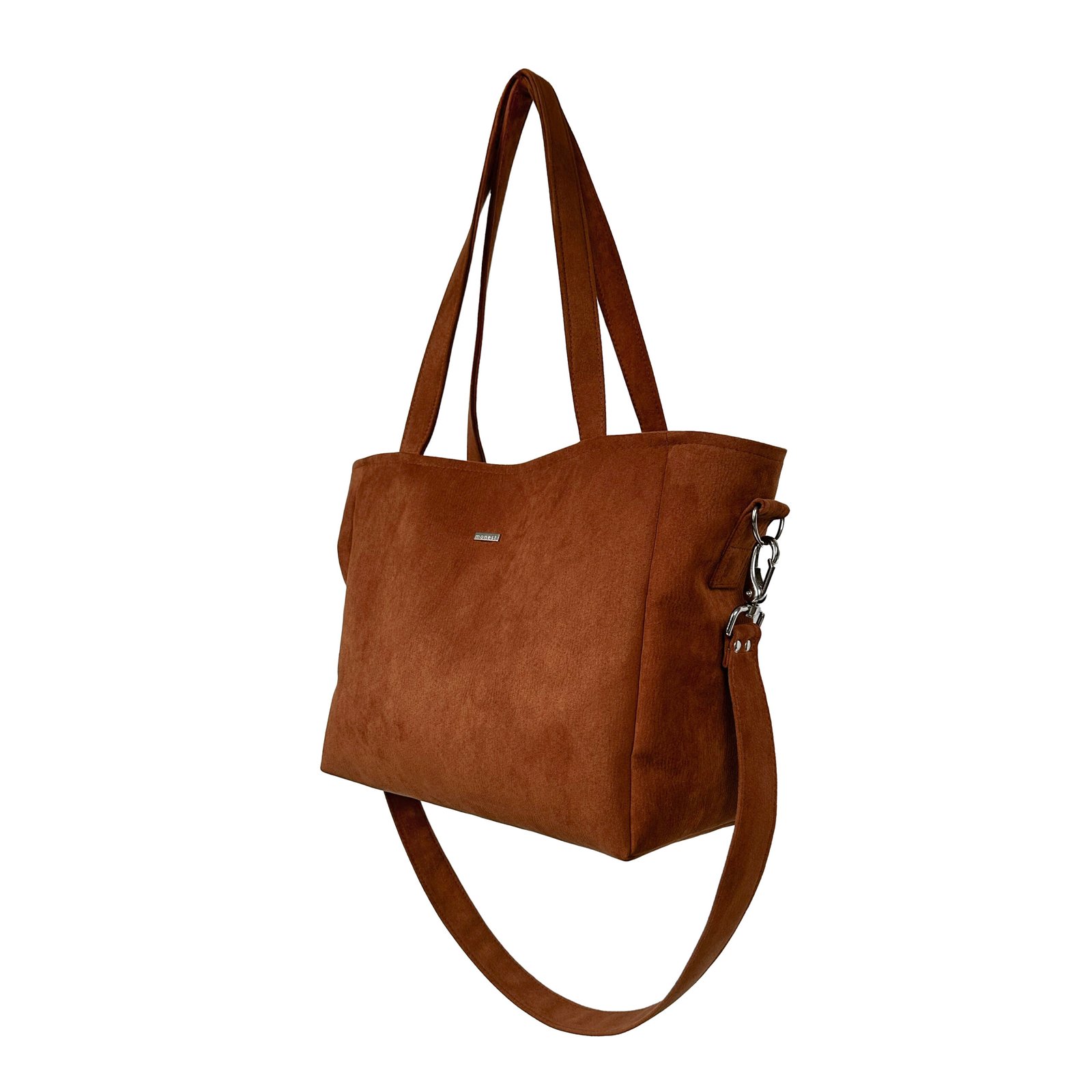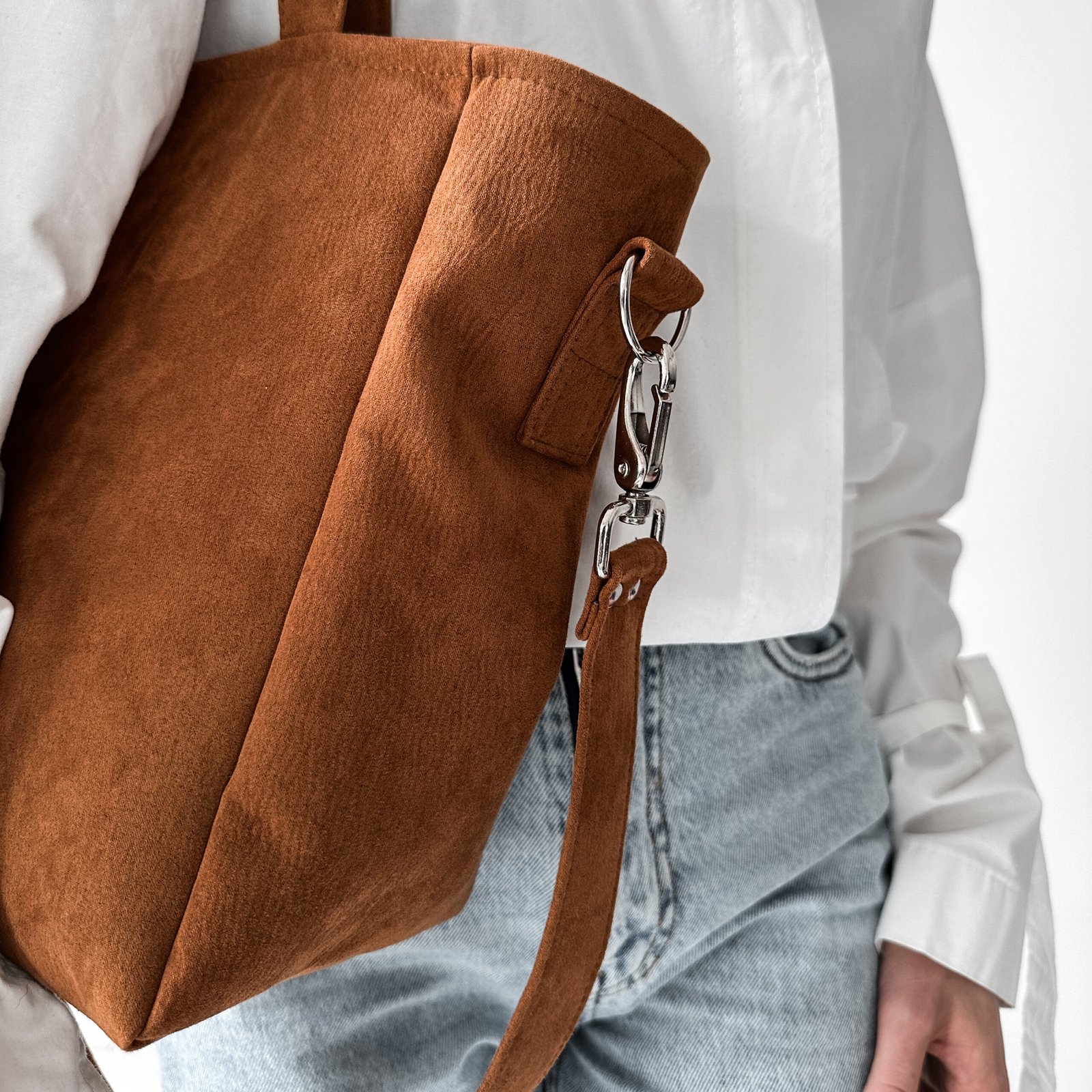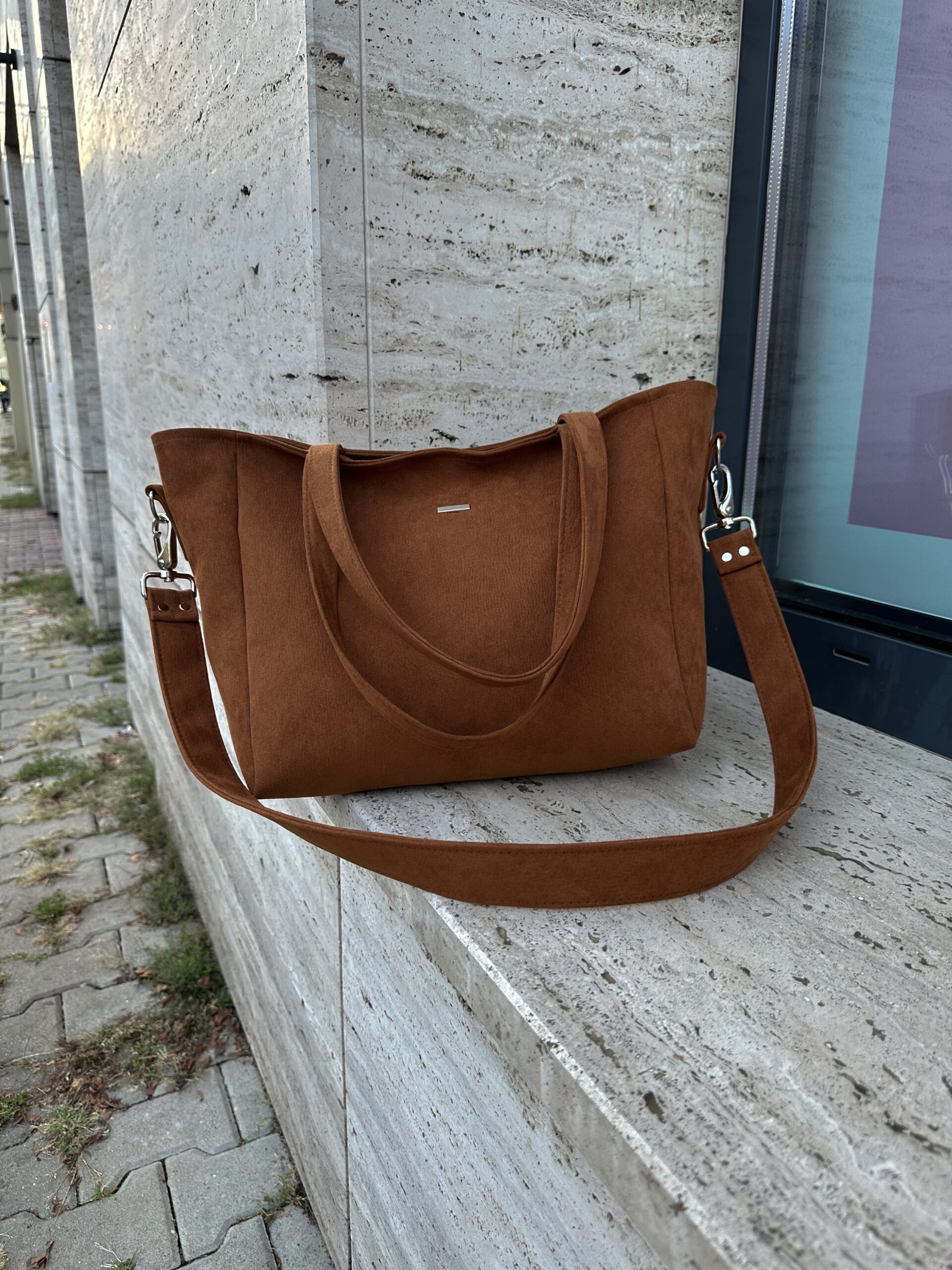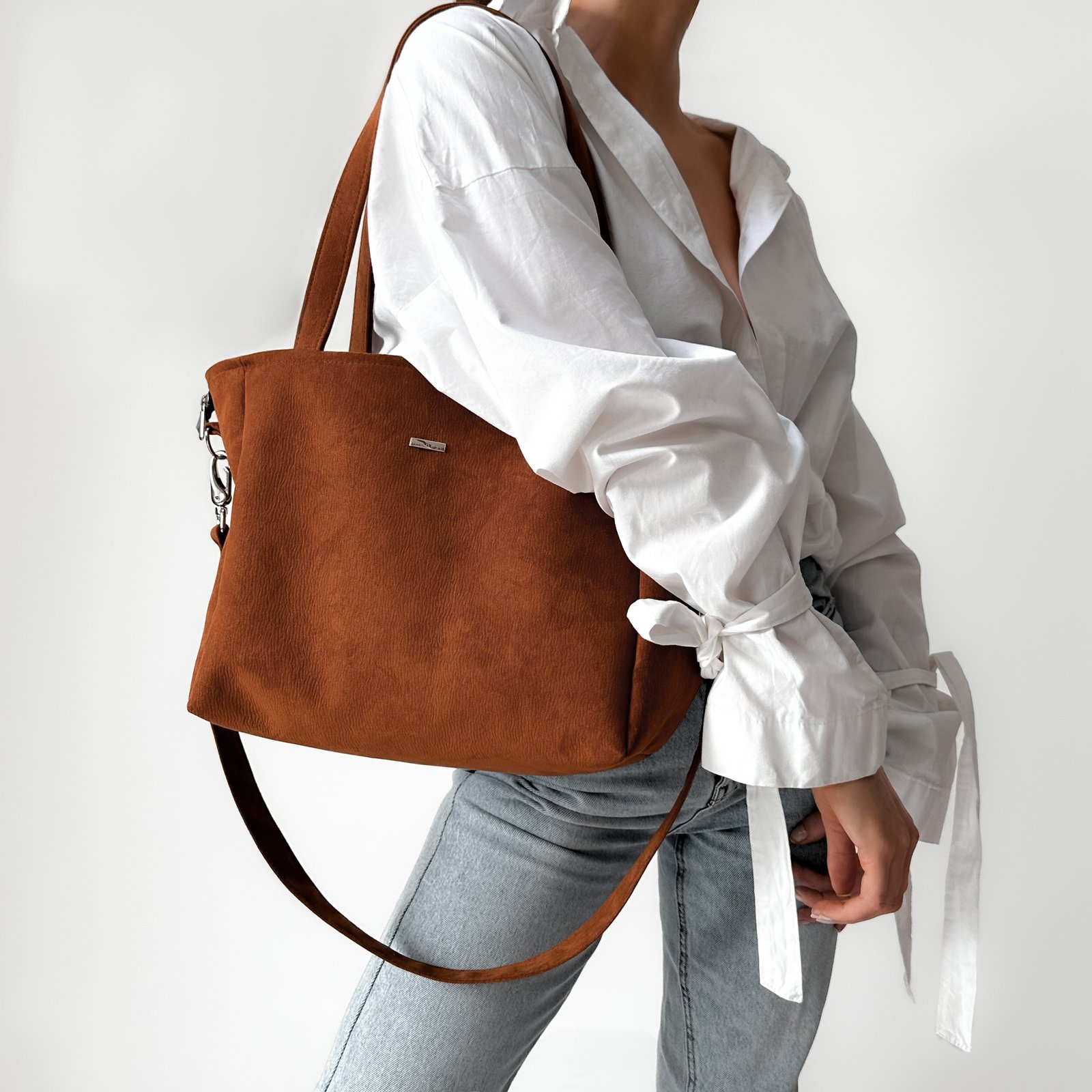 Torba z nubuku z głębokim dnem, mieszcząca format A4. Posiada długi pasek odpinany na karabińczyki. Wykonana z wytrzymałego eko zamszu tapicerskiego w kolorze rdzawo brązowym.