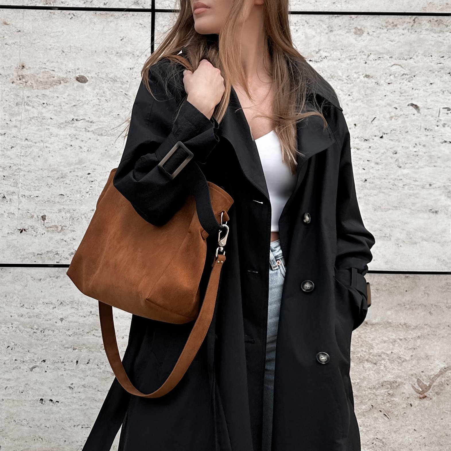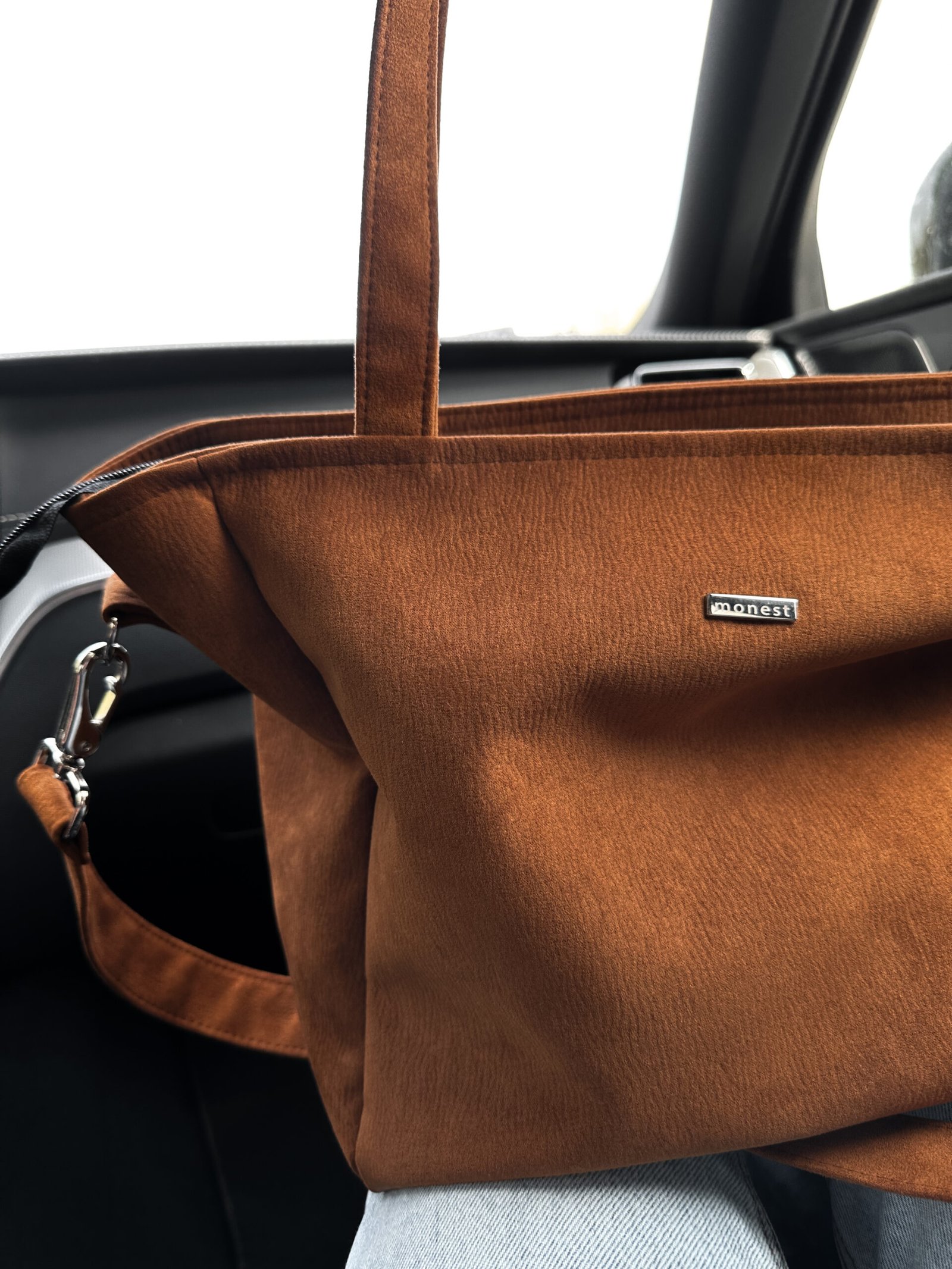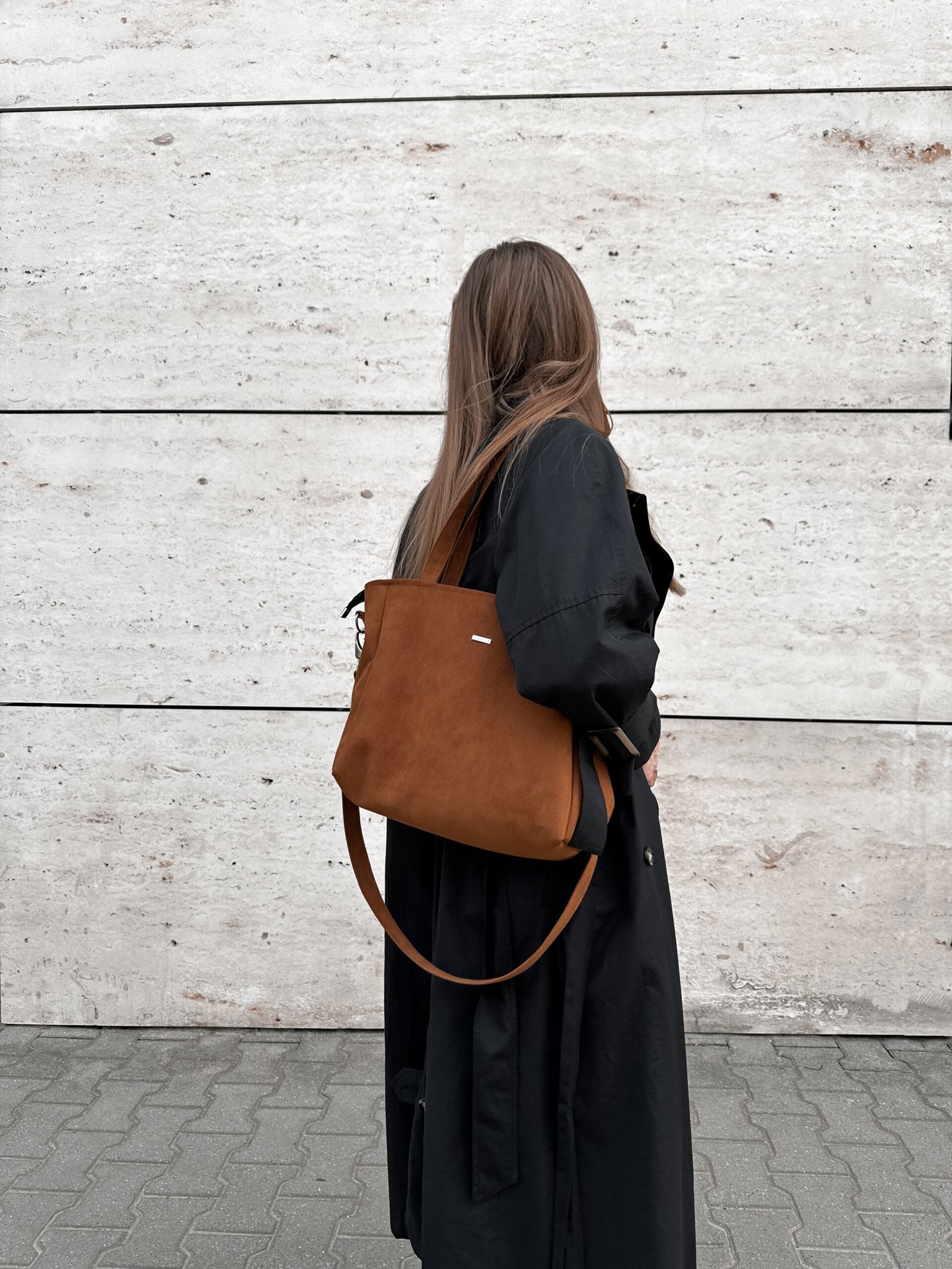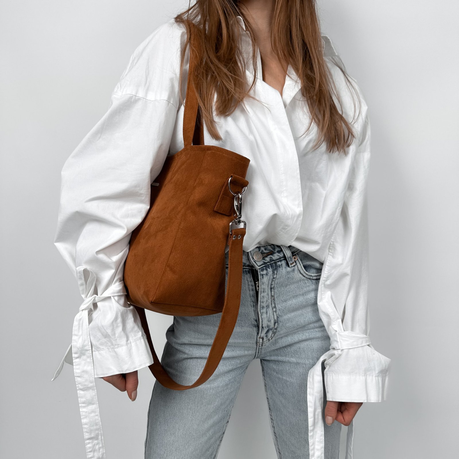 Torba z nubuku z głębokim dnem, mieszcząca format A4. Posiada długi pasek odpinany na karabińczyki. Wykonana z wytrzymałego eko zamszu tapicerskiego w kolorze rdzawo brązowym.