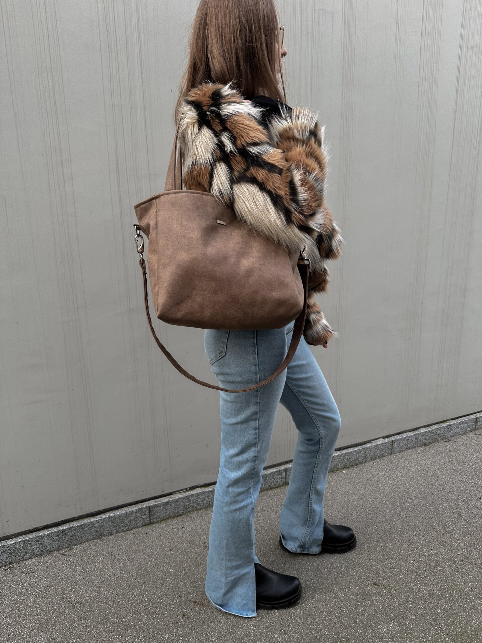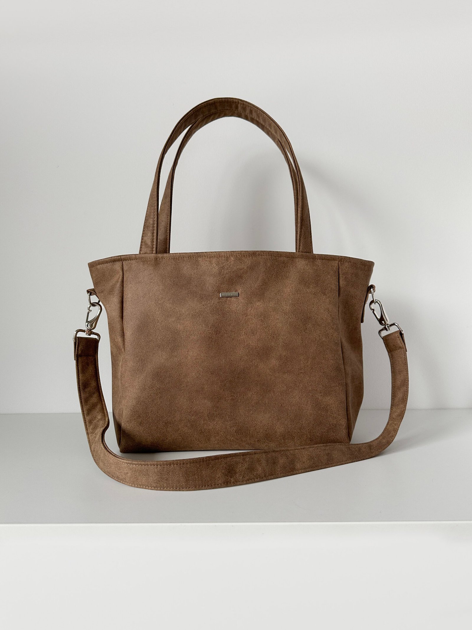 Torba z jasno brązowej tkaniny z głębokim dnem, mieszcząca format A4. Posiada długi odpinany pasek.