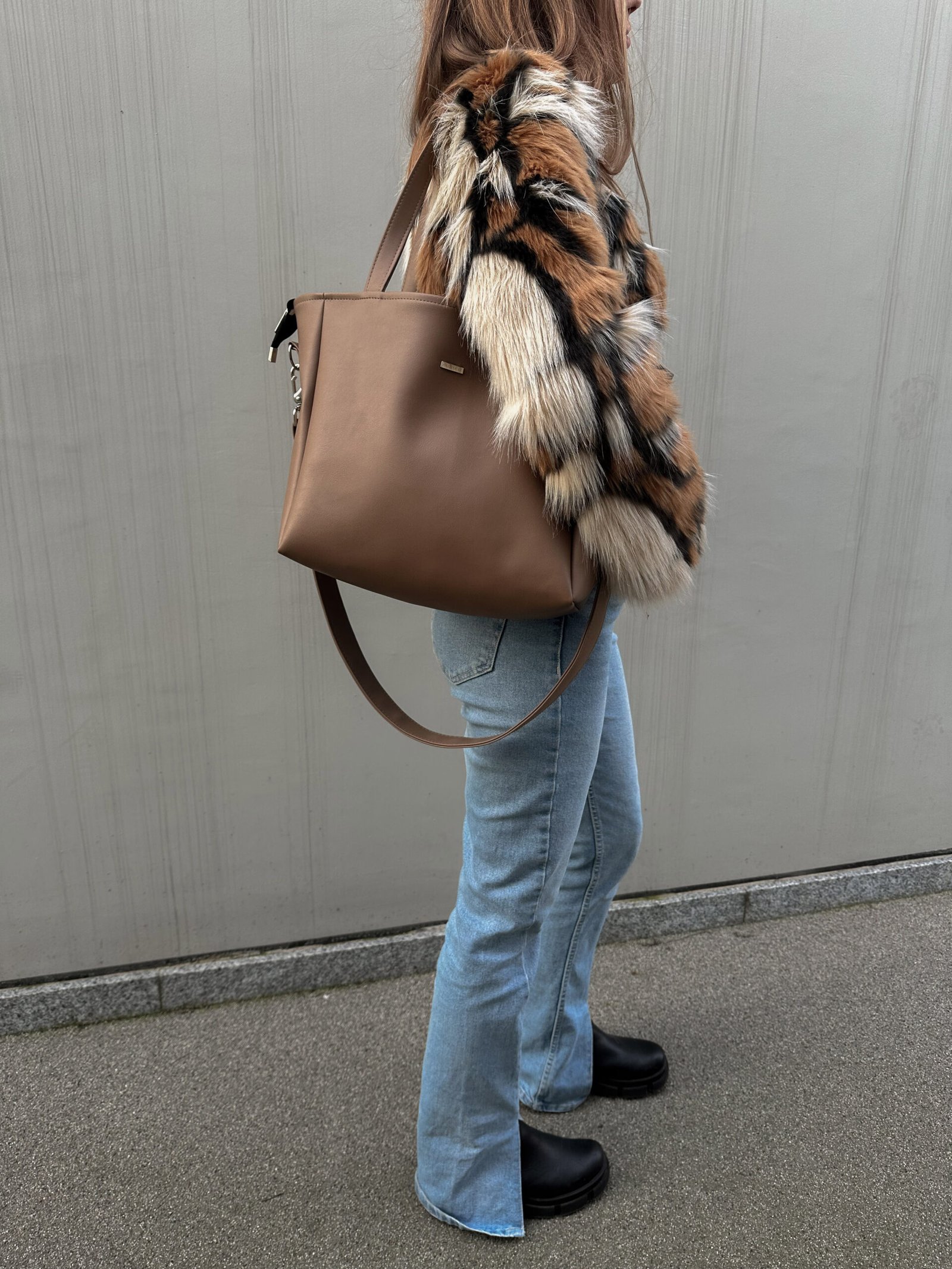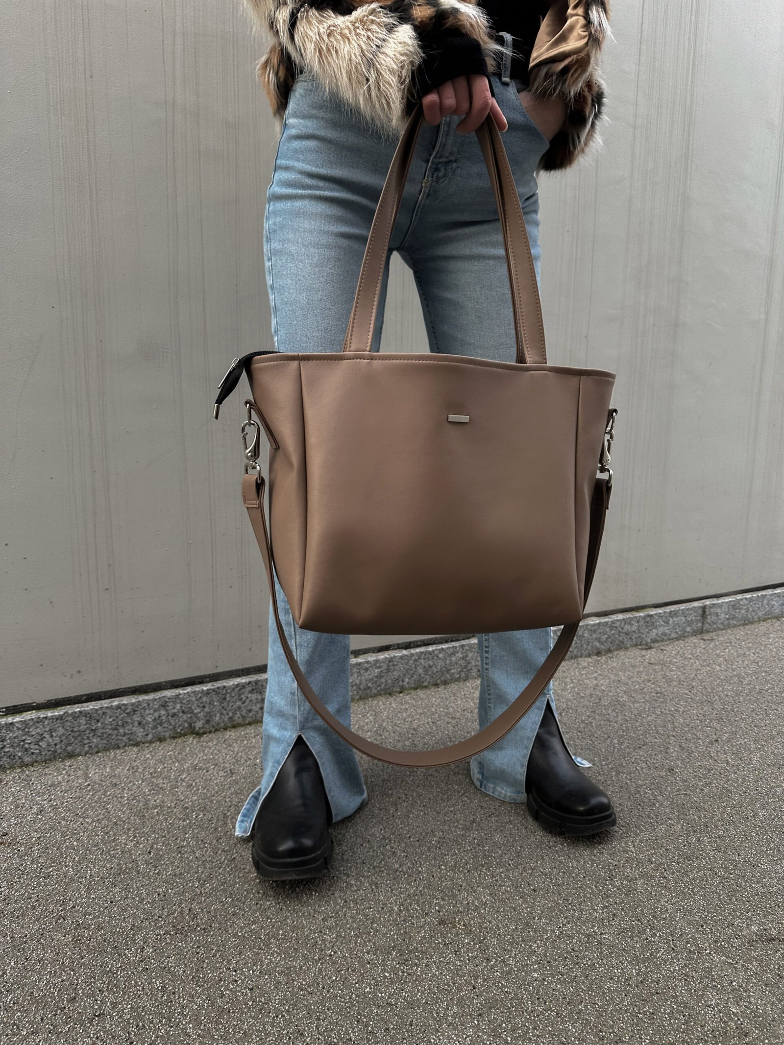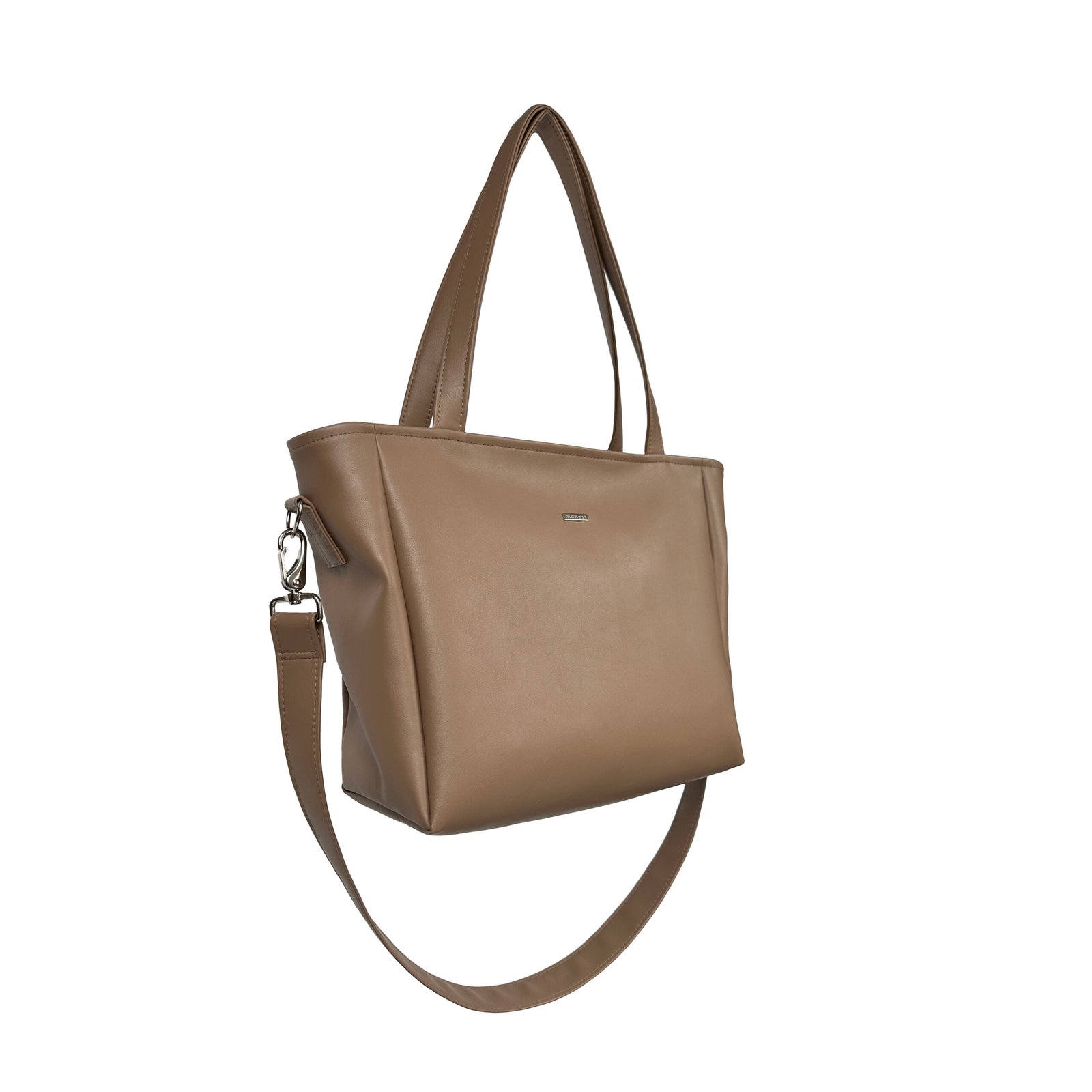 Torba z jasno brązowej eko skóry z głębokim dnem, mieszcząca format A4. Posiada długi odpinany pasek.